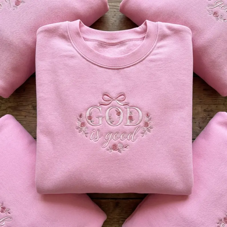 [Embroidered] God is Good Embroidered Sweatshirt, Christian Floral Bow Crewneck, Religious Gift for Women, Faith Based Aesthetic Apparel