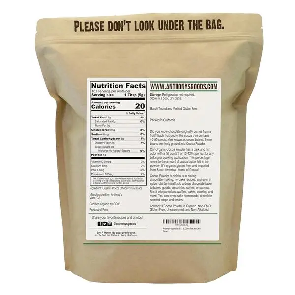 Anthony's Cocoa Powder is Organic, Non-GMO, Gluten Free, Unsweetened, and Non-Alkalized.