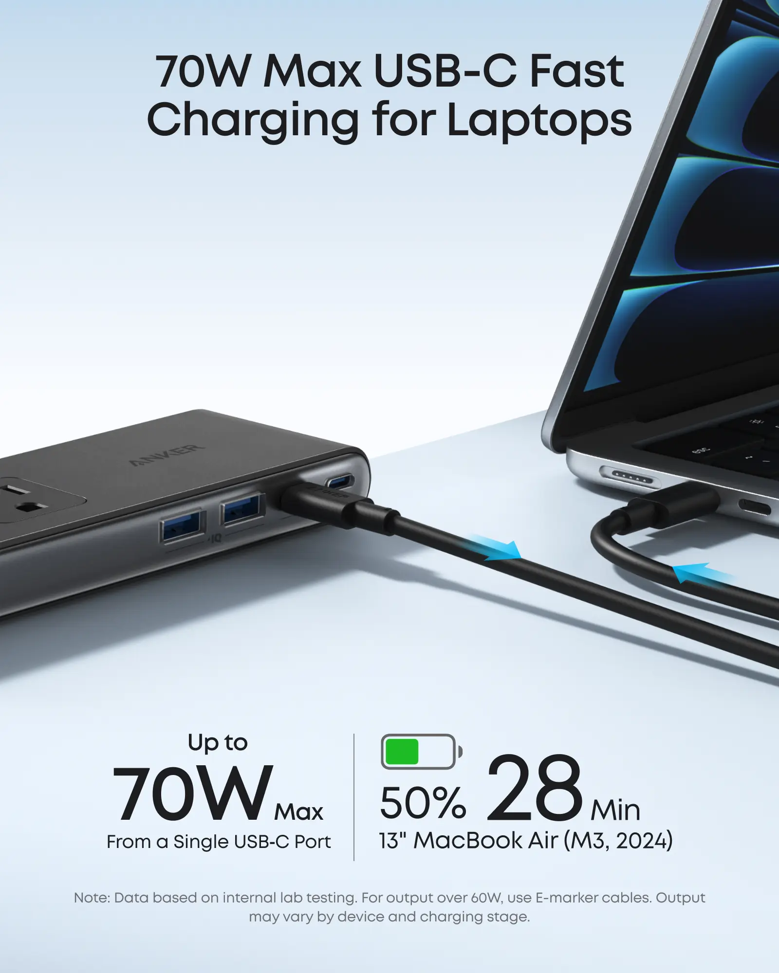 Charge a MacBook, tablet, or iPhone with flexible power output. A singleUSB-C port delivers up to 70W to 70W