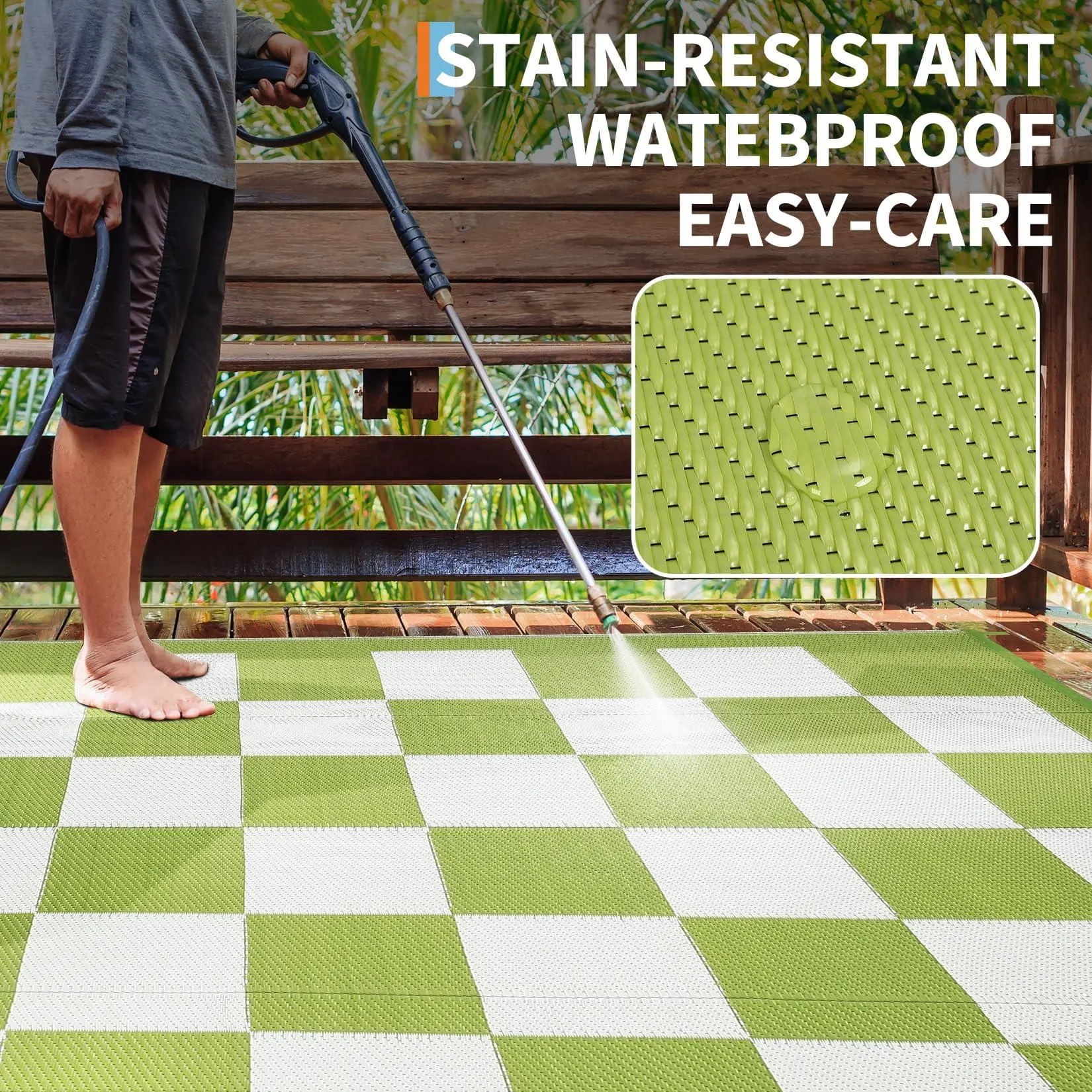 Waterproof & UV-Resistant: Crafted from 100% virgin polypropylene, our outdoor patio rug is double-sided woven for superior durability. UV-protected and heat-edge treated, it won't fade or get damaged by sun exposure. Use this waterproof outdoor rug as an outdoor carpet for your garden, picnic, camping, or RV—built to withstand the elements