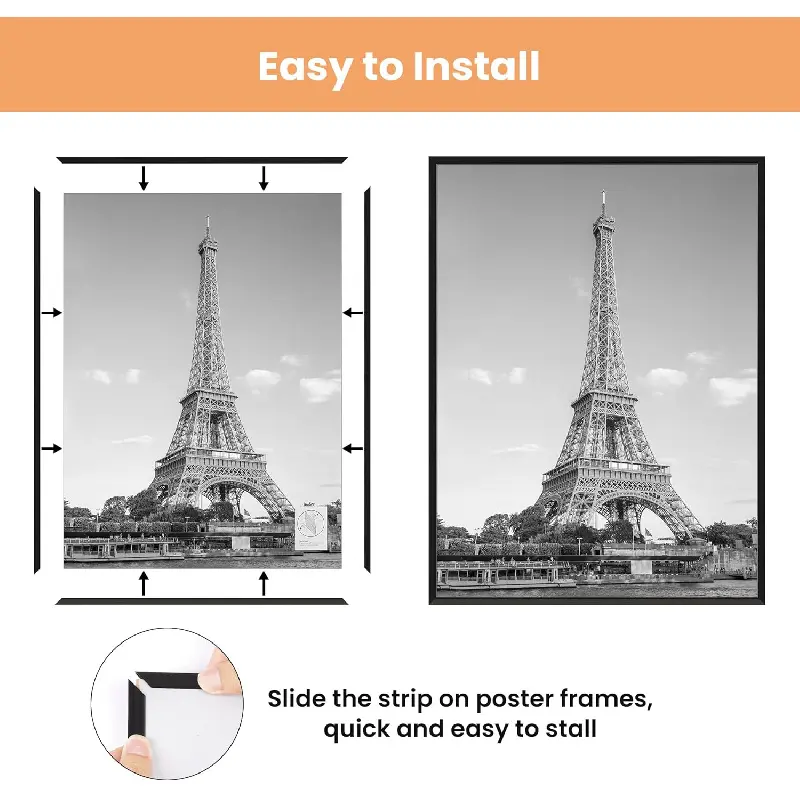 · Is it easy to install?Yes, you can easily complete the installation and replacement of photos by simply sliding the frame strips across the cover and backboard, which is especially designed for large-sized picture frames to achieve the lightness.