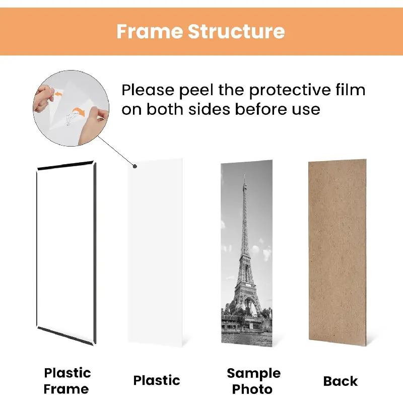 · What is the material of this poster frame?Both the frame strips and covers are made of plastic, which ensures that even large-sized poster frames can be easily hung without worrying about falling or hitting kids or pets.