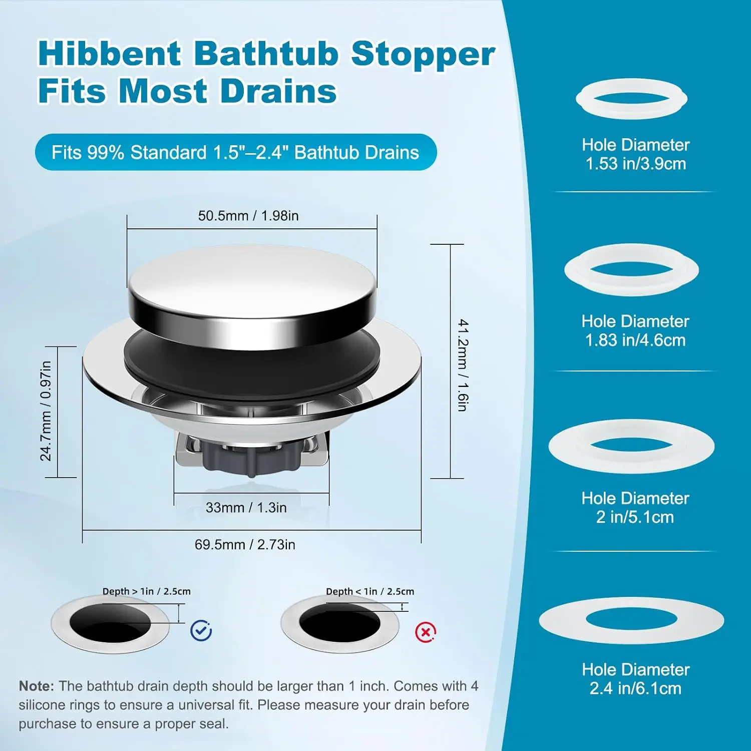 ·[Universal Compatibility] The Hibbent bathtub drain hair catcher is designed for maximum compatibility, fitting nearly all standard U.S. bathtub drains with a diameter of 1.5–2.4 inches and a depth of over 1 inch. To ensure a tight, secure seal for approximately 99% of standard tub drain openings, it includes 4 silicone rings of different sizes. For the best fit, please measure your bathtub drain diameter and select the appropriate silicone ring during installation. Please note: This product is not compatible with cable-driven tub drains or bathroom sinks