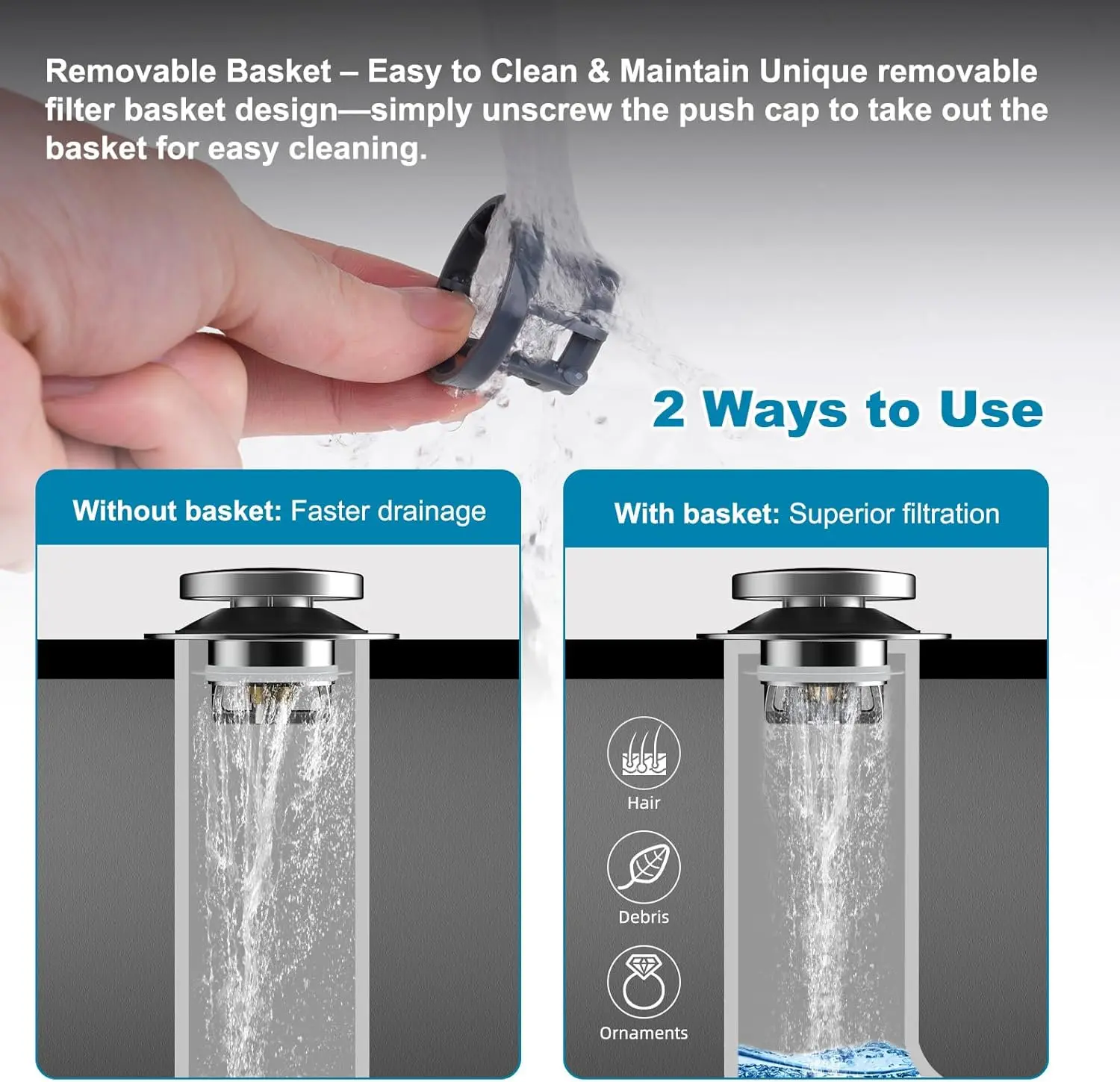 ·[Innovative Removable Filter Basket] This innovative tub stopper features a removable filter basket that actively catches hair, pet fur, and even small items like jewelry, preventing clogs before they start. For ultimate cleanliness, the entire unit disassembles effortlessly once the basket is removed, allowing for a thorough, hygienic scrub in seconds. It's the smarter, more sanitary upgrade from traditional, hard-to-clean stoppers