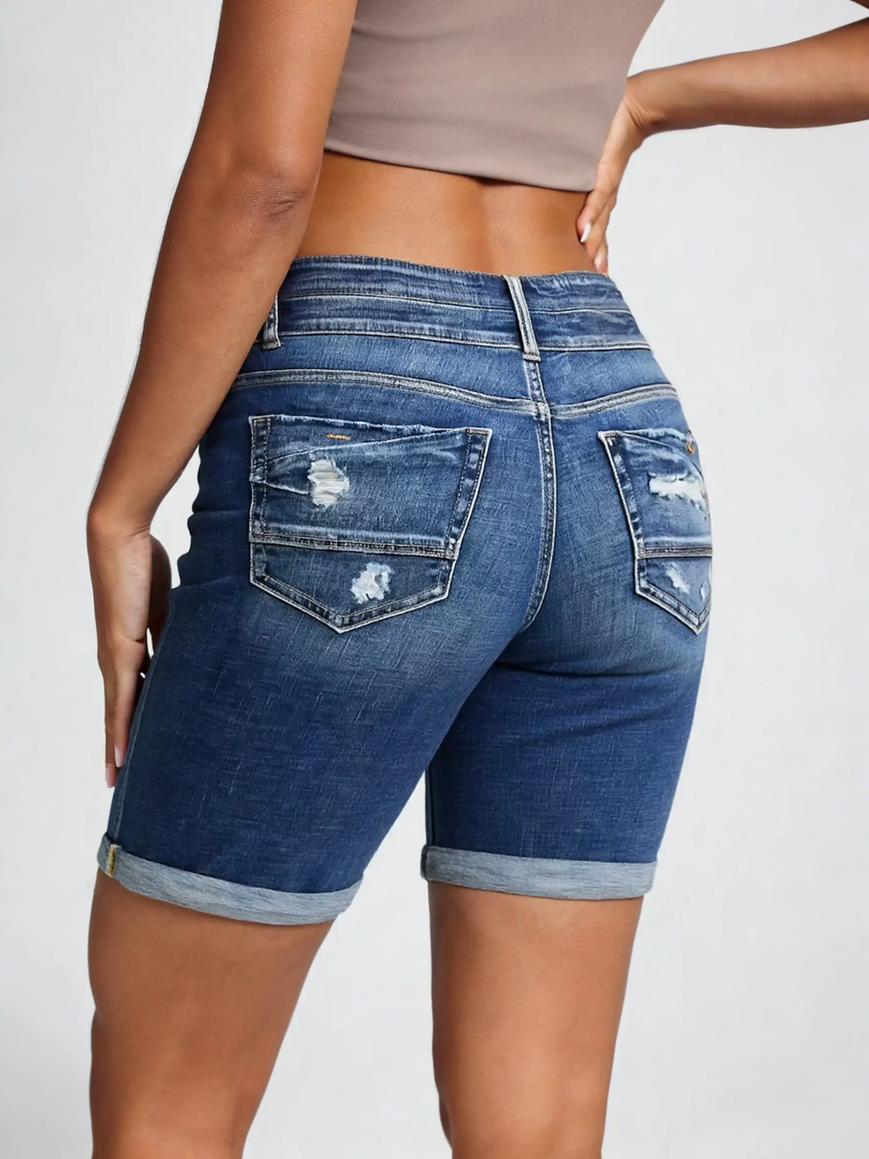 Plus Size Women's Ripped Denim Jean Shorts High Waisted Stretchy Folded Hem Short Jeans for Everyday Wear Comfortable & Stylish Bottom - Womenswear