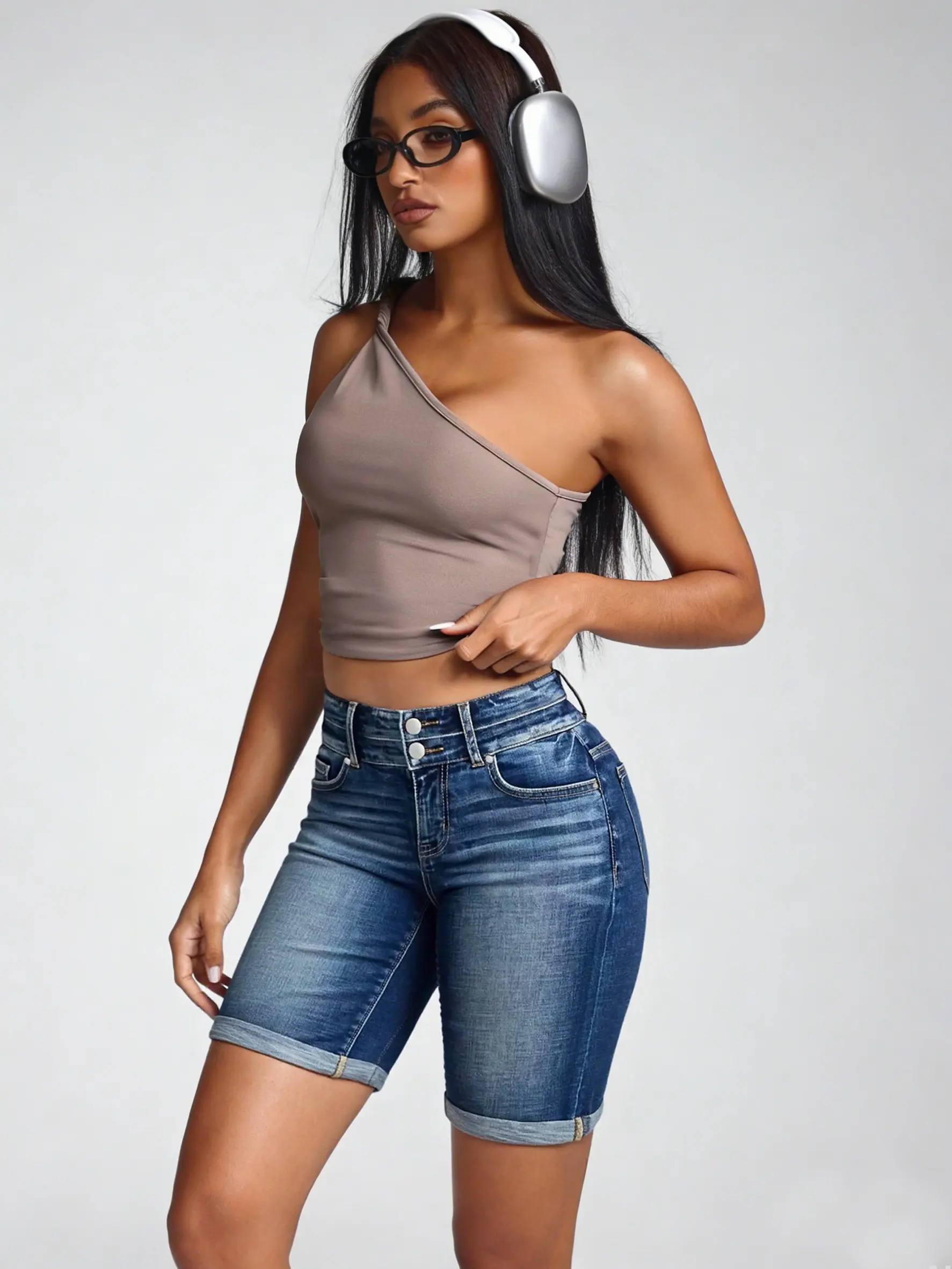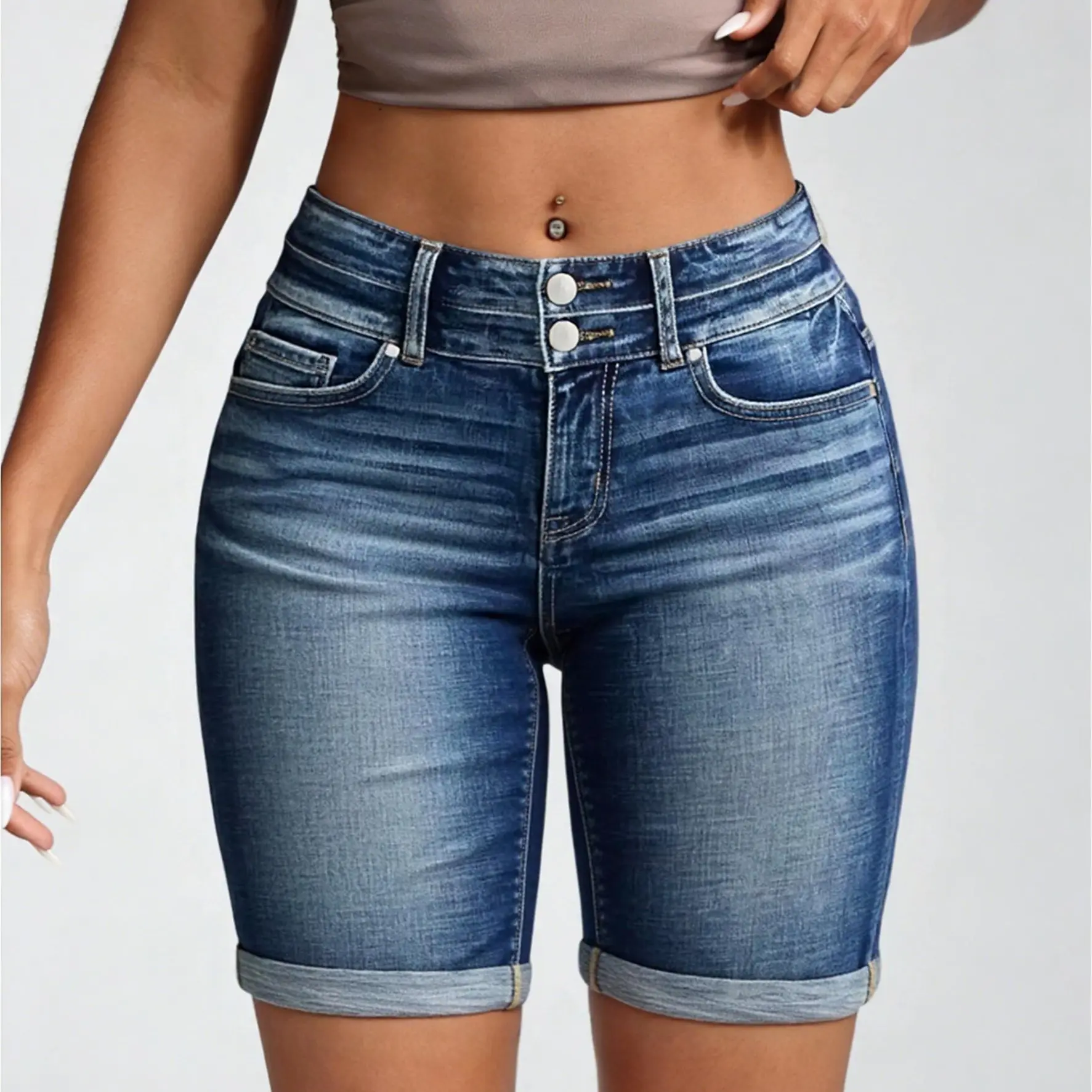 ✨ These high-waisted denim shorts are perfect for plus-size women. They feature a ripped design that adds a trendy touch. The stretchy material ensures a comfortable fit, making them ideal for everyday wear. The folded hem adds a unique flair to the classic denim look.