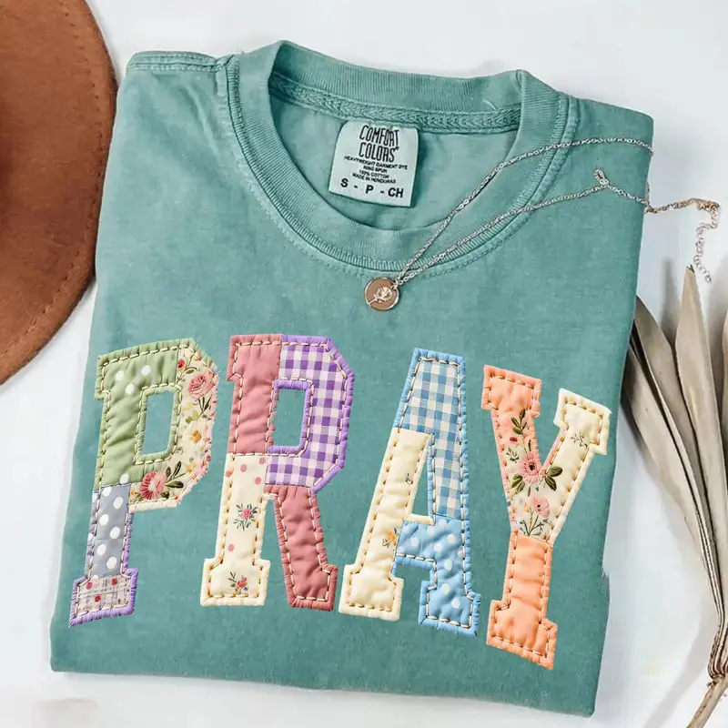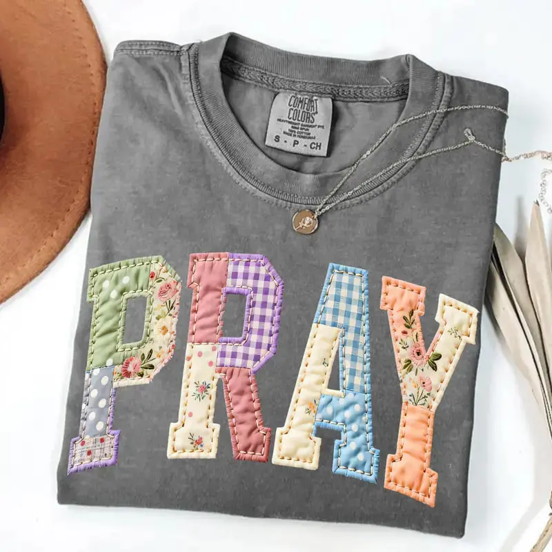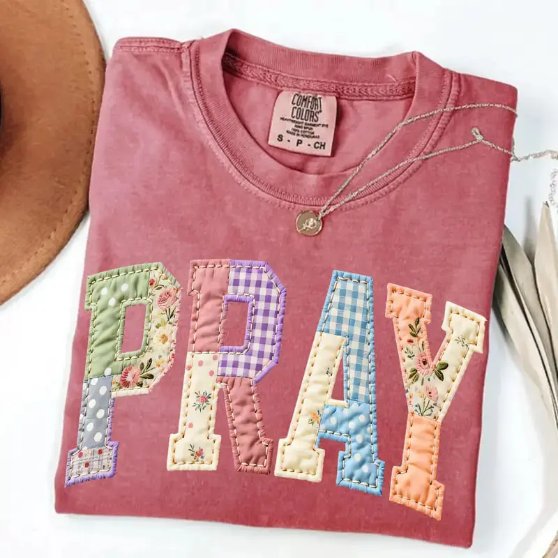 Comfort Colors Pray PRINTED T-shirt Faux Quilted Religious Faux Easter Christian Varsity Faith Tshirt Preppy Cottagecore Jesus Gift