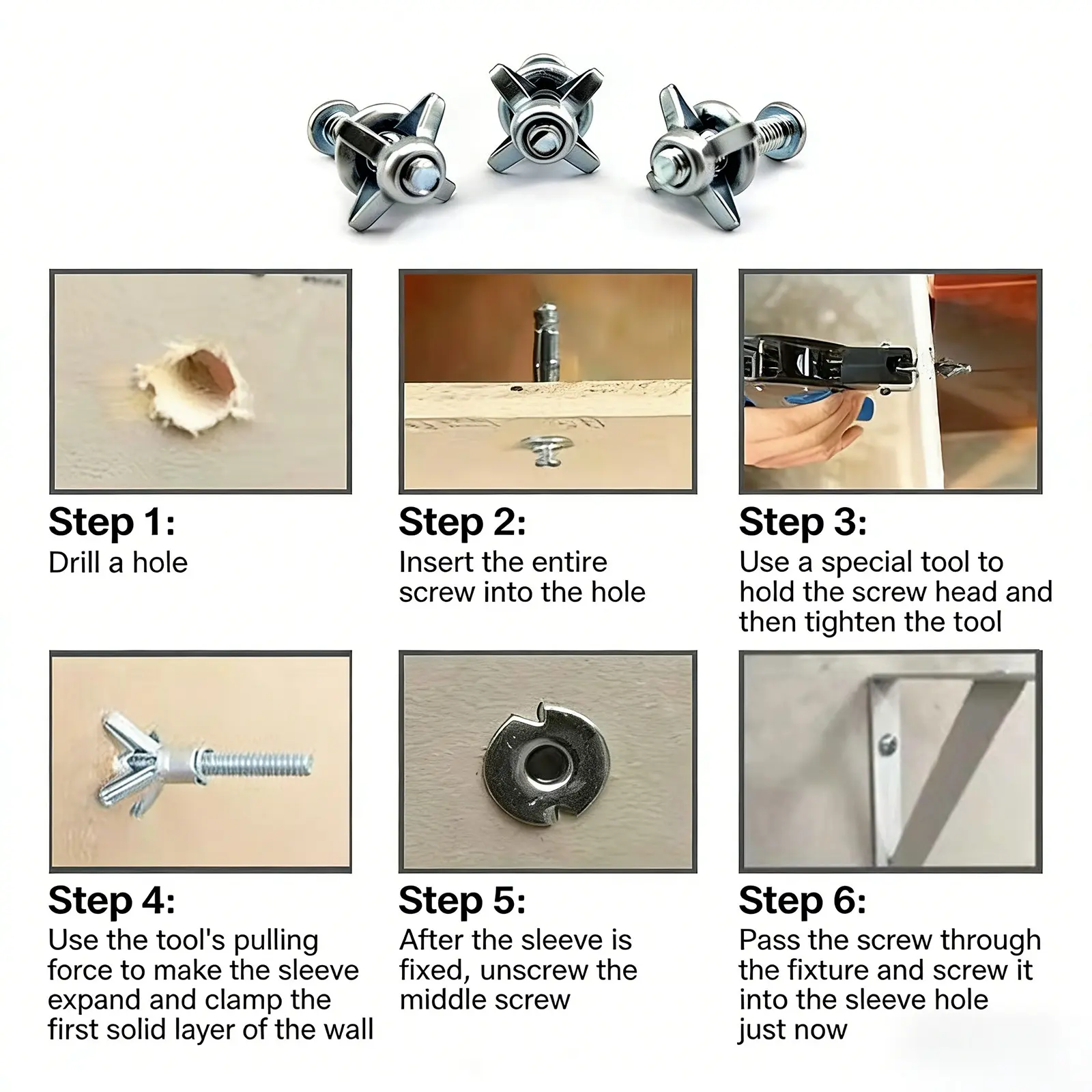 【EASY INSTALLATION】 : Simple 4-step process: Drill hole, insert anchor, pull bolt to expand petals behind wall, secure item