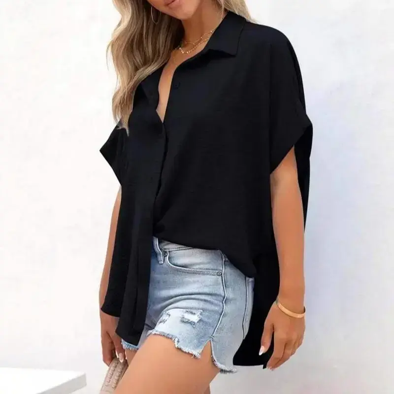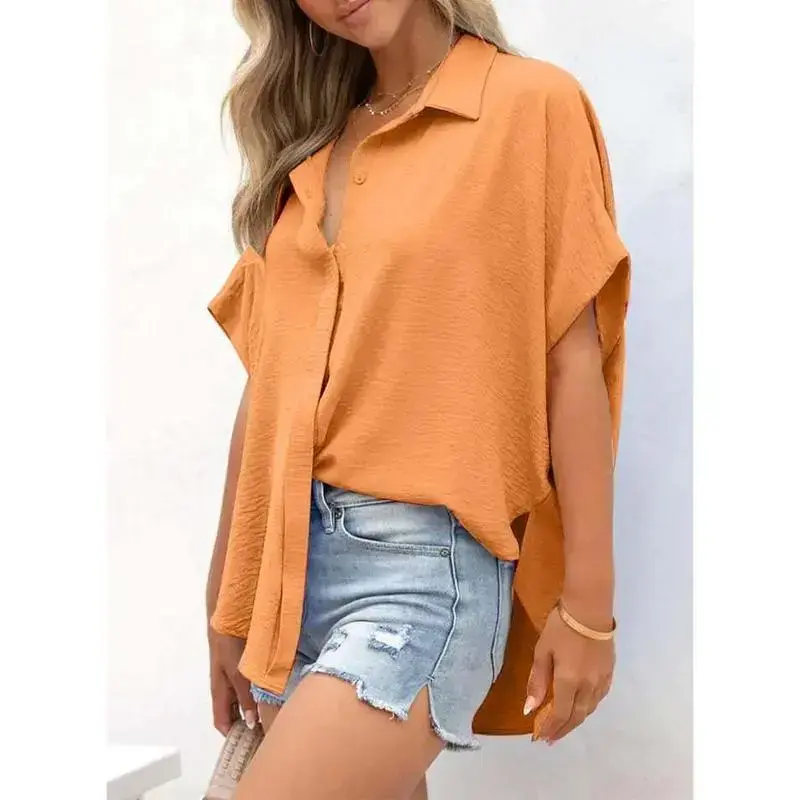 This short - sleeved button - down shirt is a casual - chic essential. The classic collar and button - up front offer a timeless look, while the loose, oversized fit provides both comfort and a trendy, laid - back vibe. Crafted from lightweight fabric, it's perfect for warm days, whether you're running errands or meeting friends. The longer back hem adds a stylish detail. Pair it with denim shorts like shown, or opt for jeans, skirts for different looks. Add some delicate jewelry to elevate the overall style. It's a must - have piece for those who love effortless, fashionable casual wear.