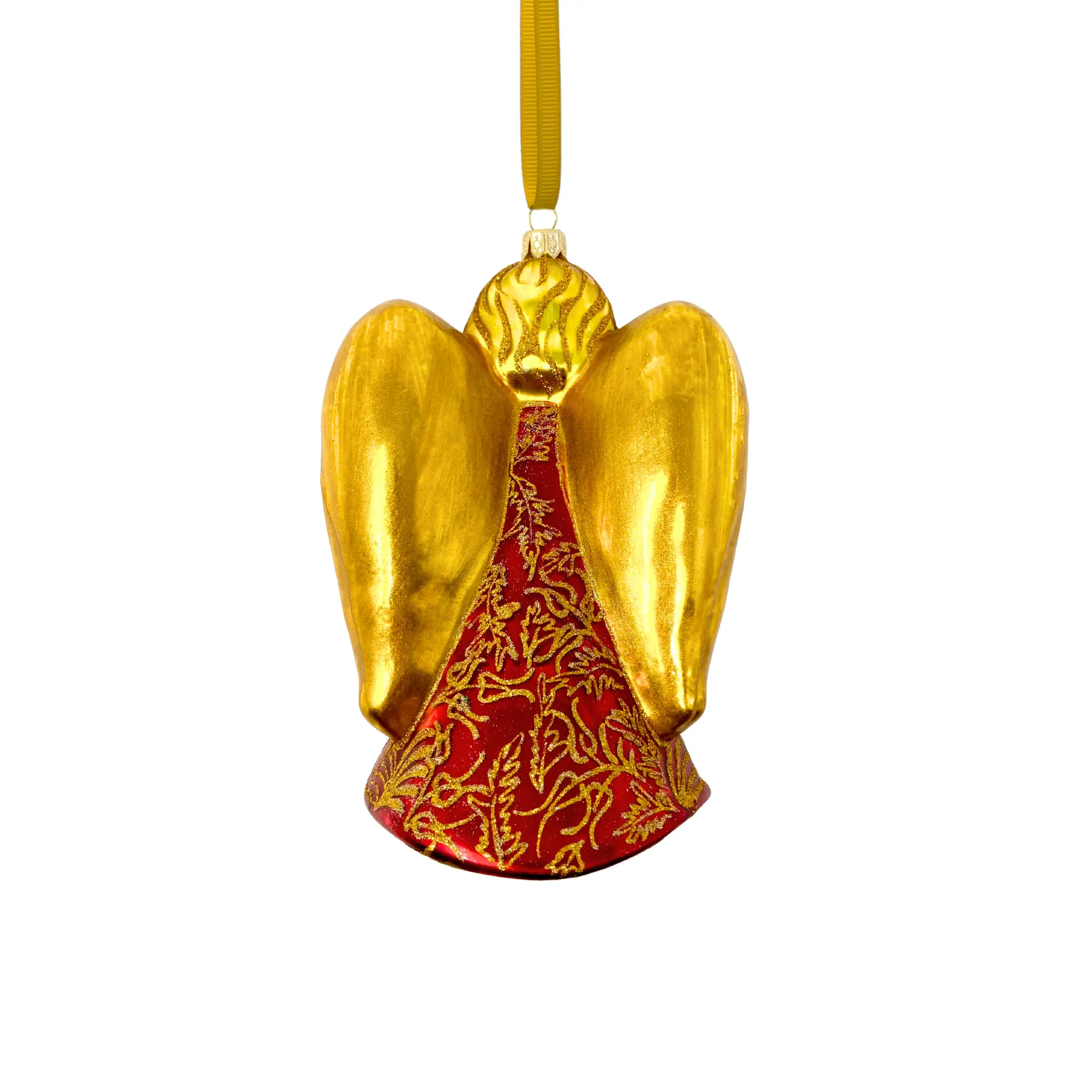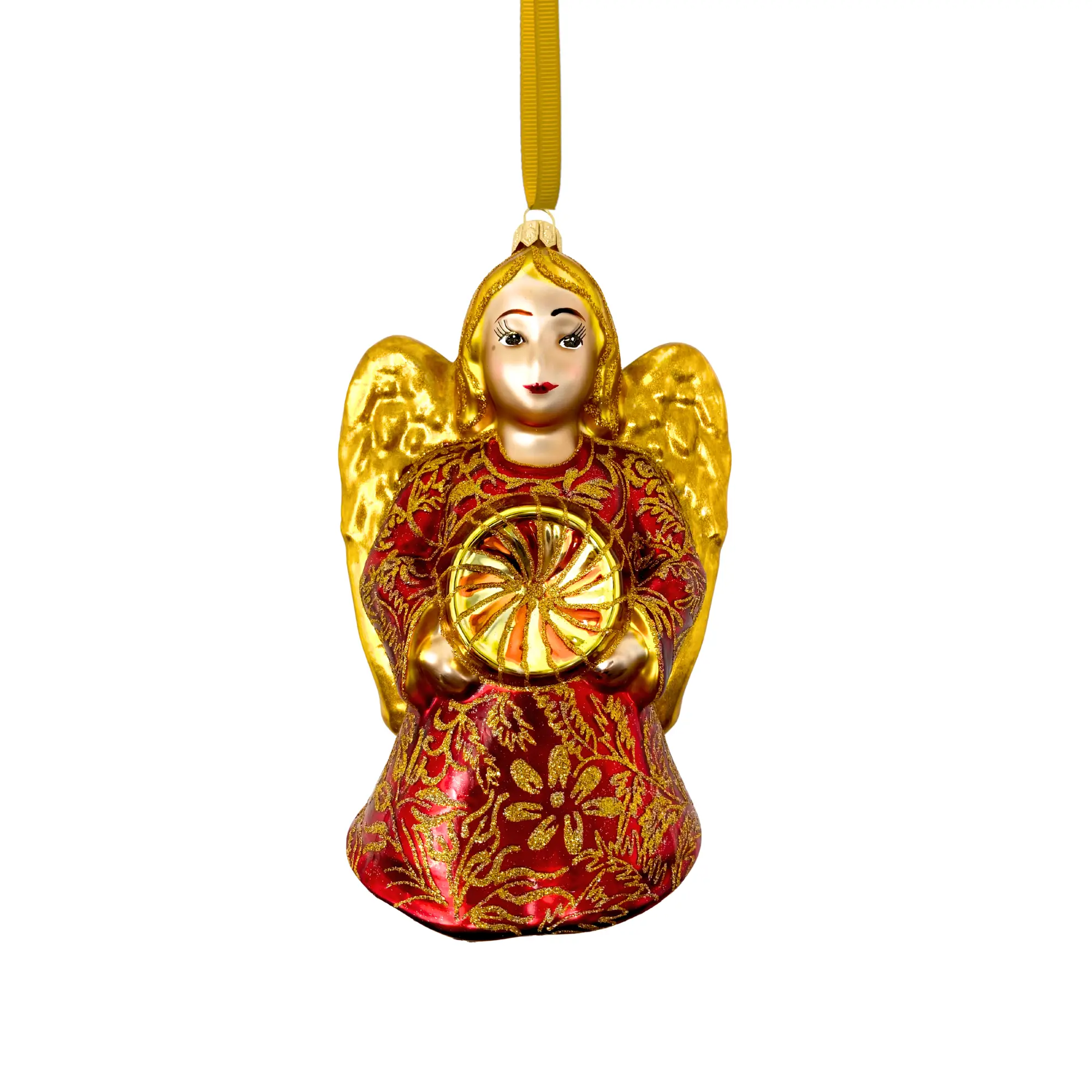 Her crimson gown blooms with intricate gold detailing, rich and celebratory without feeling loud. The reflector at her center glows like a small sun, framed by luminous wings and polished accents. She carries a feeling of quiet confidence. A gentle brilliance that feels both classic and elevated.