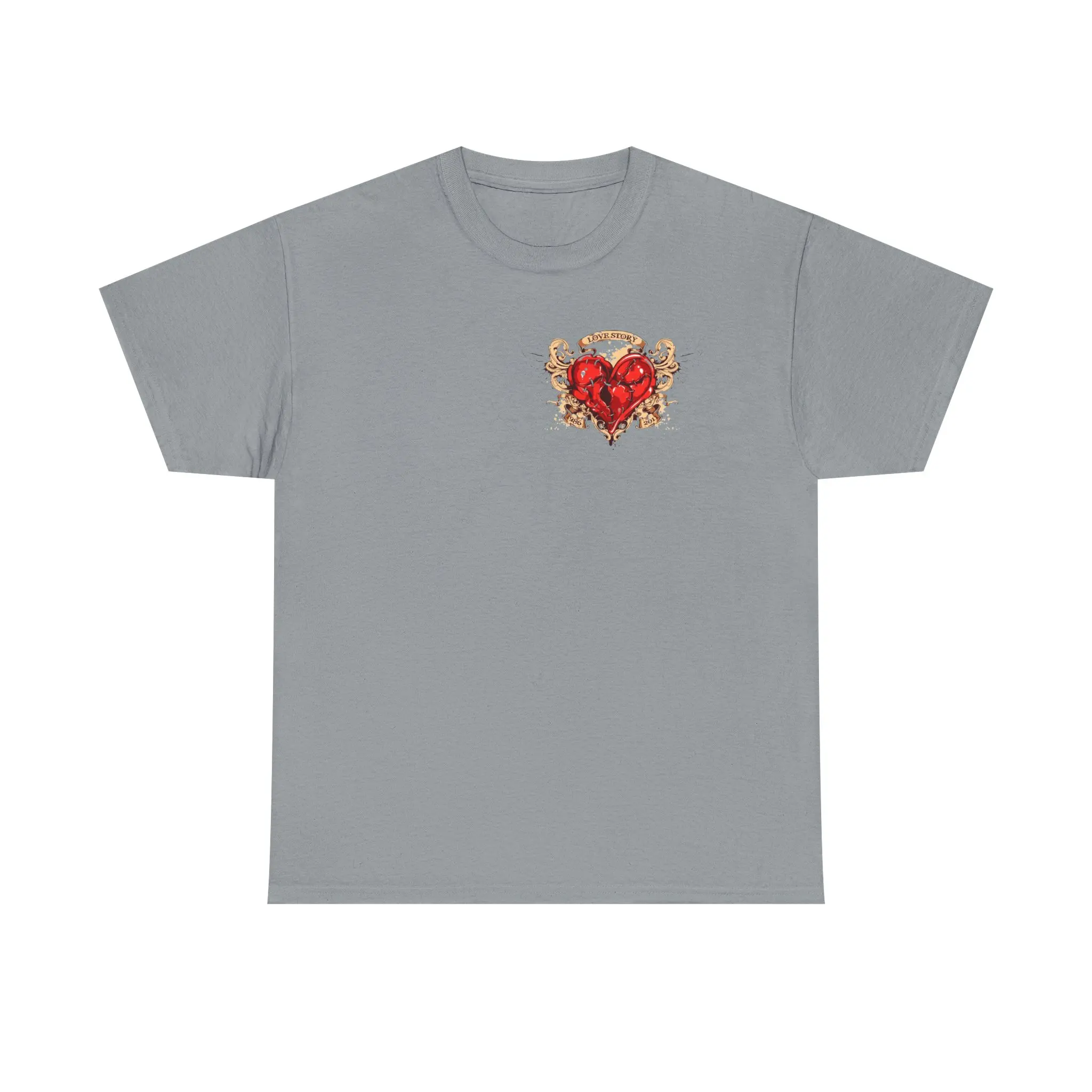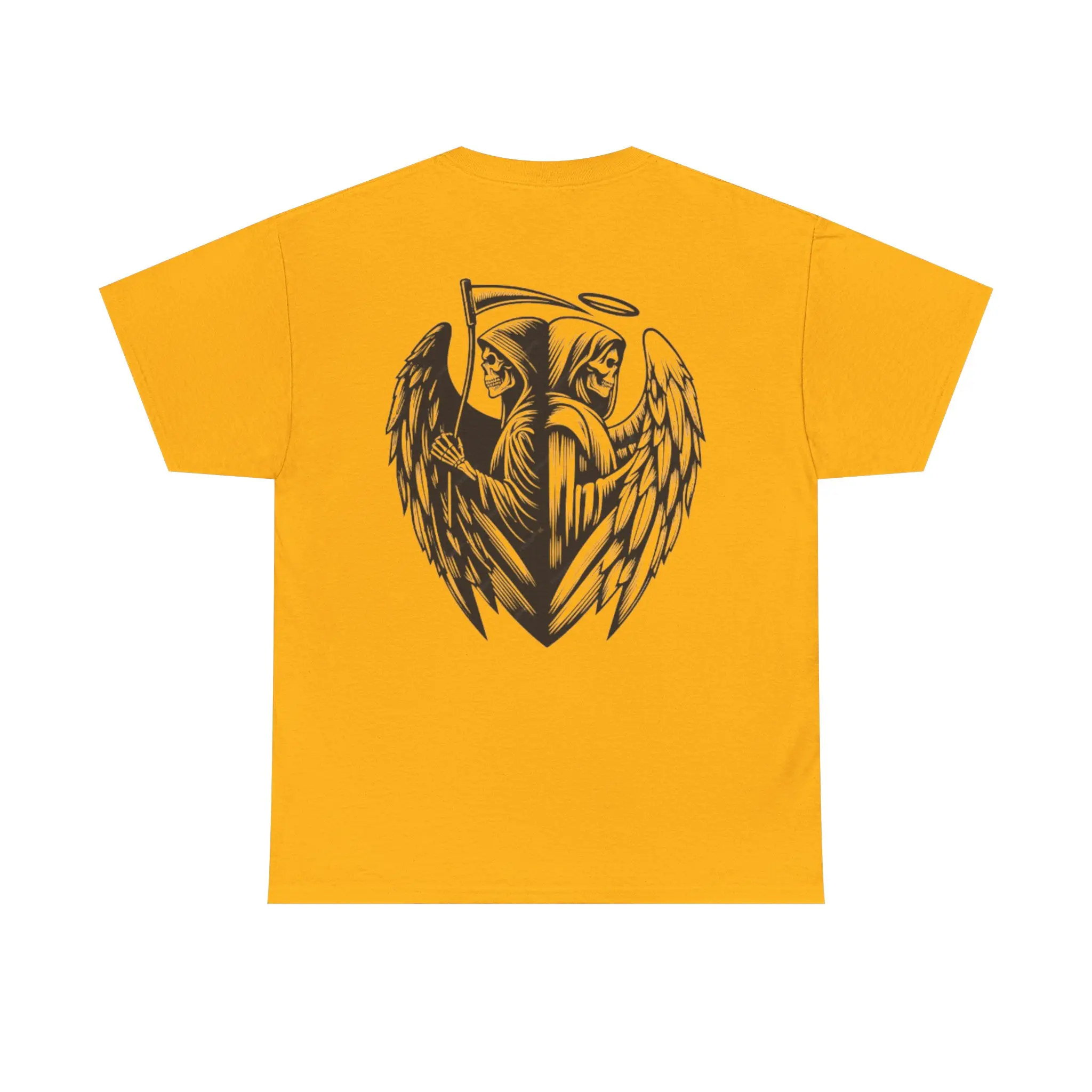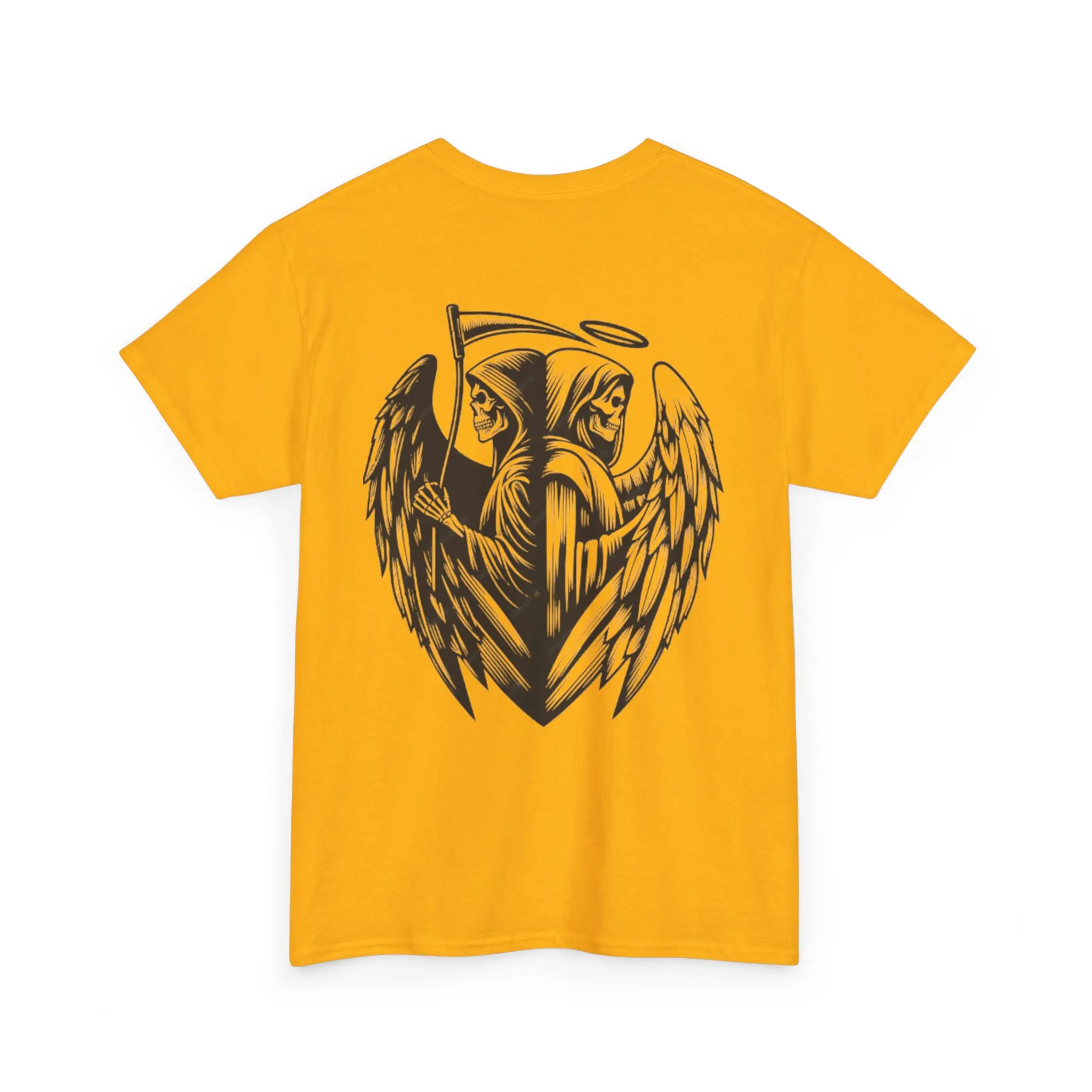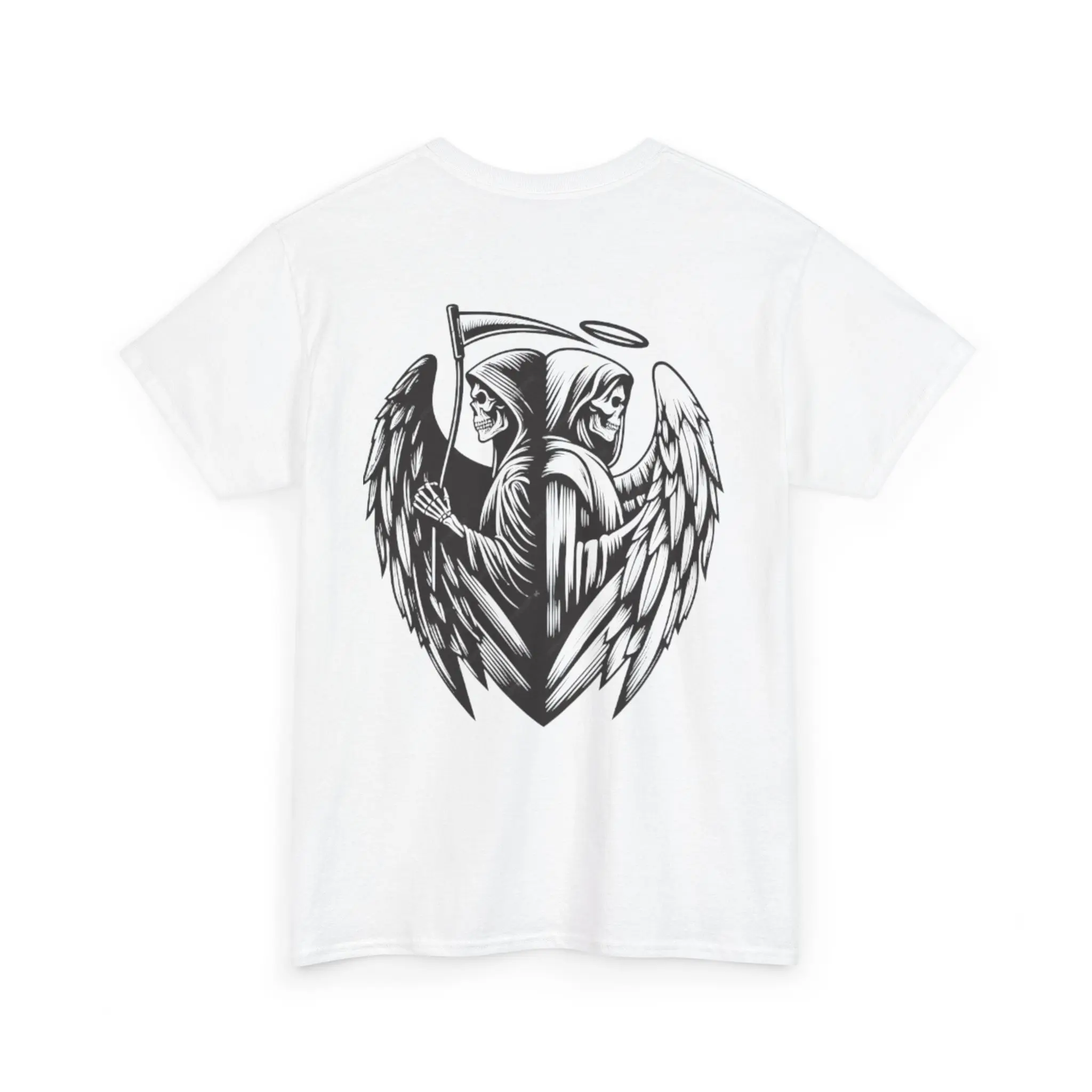 A crisp, lived-in tee that carries quiet intensity. Soft, midweight cotton drapes easily while the front chest shows a small, blood-red anatomical heart wrapped in thorny gold filigree — intimate and defiant. The back unfurls a larger, monochrome guardian: a winged reaper with a halo and scythe, drawn with tattoo-style shading that reads like a story in ink. Wear it when you want clothing that feels like a private emblem — for late-night drives, skate sessions under sodium light, or a gallery crawl where your look speaks before you do. The classic crew neck and relaxed fit make it a go-to layer: paired with worn denim, a flannel tied at the waist, or under a leather jacket, it anchors an outfit with moody, artful strength. It doesn’t shout; it reveals itself to the people who notice the details.