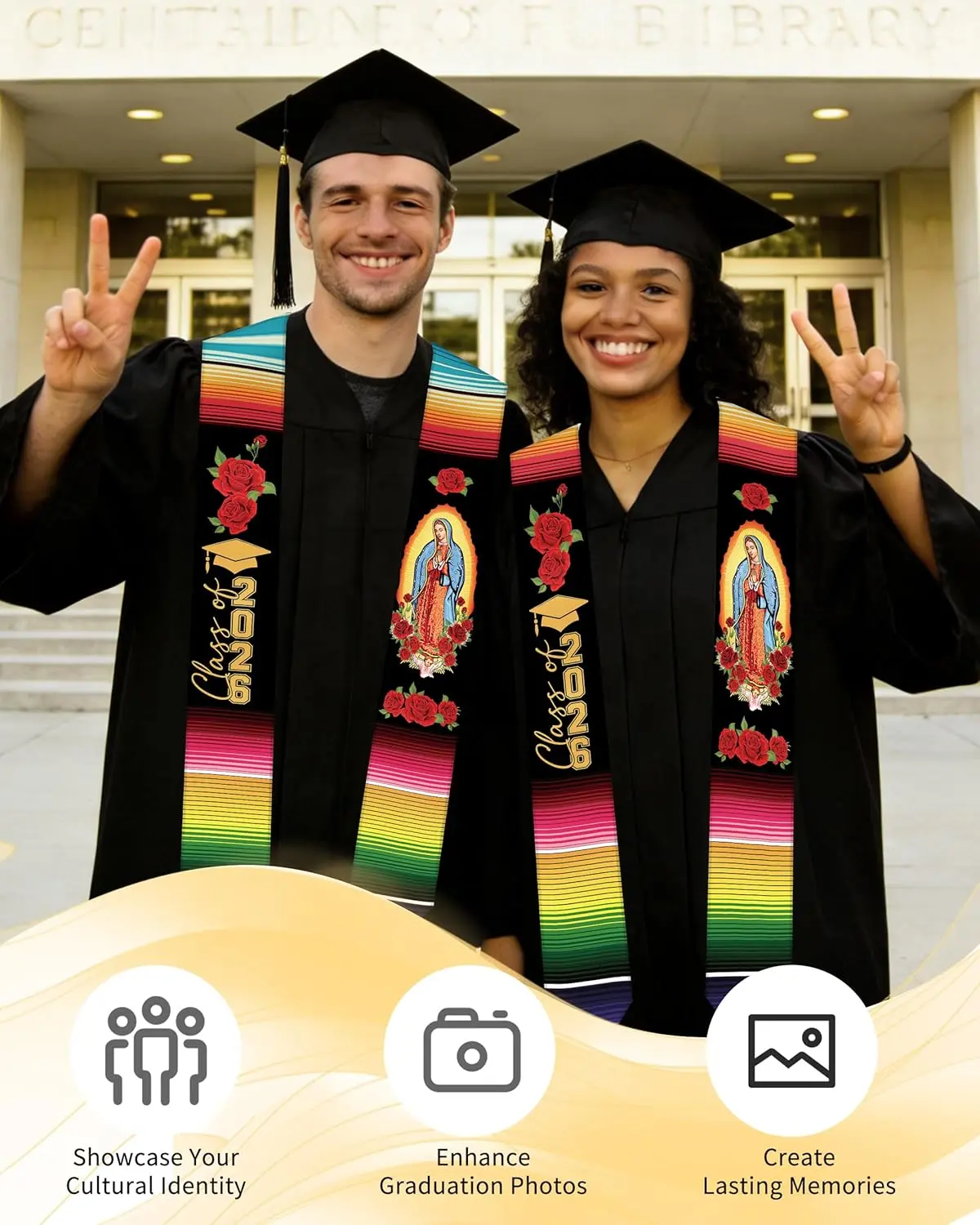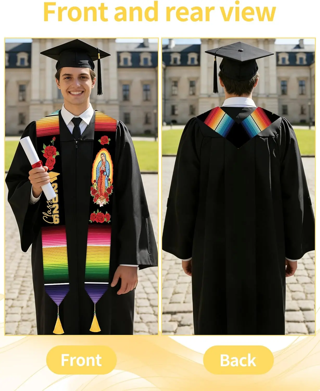Mexican American Graduation Sash 2026 for USA + Mexico PrideGraduation is a once-in-a-lifetime milestone—and for many families, it’s also a moment of identity. This mexican american graduation sash is designed for Class of 2026 grads who want their culture seen in a respectful, photo-ready way. The look pairs a formal black background with gold trim, finished with USA and Mexico flag elements that represent dual heritage with pride.USA + Mexico Symbols with Eagle DetailThe artwork highlights an eagle design with mexico and usa graduation sash styling, bringing together the two flags in a clear visual statement. It’s a meaningful choice for Mexican American grads and families celebrating bicultural roots, community pride, and the journey it took to reach graduation day.Adult Size That Wears Neatly Over GownsSized at about 70 x 4.9 inches, this graduation stole 2026 style sash drapes smoothly over most caps and gowns without extra setup. It’s ideal for long ceremonies, stage walks, and back-to-back photos with family and friends at school events and celebrations.Made for Ceremony Photos and KeepsakesThe high-contrast black-and-gold finish helps the design stand out in crowd shots and group pictures while still looking formal. Whether you’re attending a high school graduation, college commencement, or a cultural recognition ceremony, it’s an easy way to add meaning to your graduation outfit and keep the memory close after the day is over.Care and NotesStore flat or loosely folded in a dry place before the event. Smooth the sash before photos for a clean look. Designed as a wearable graduation accessory for ceremonies, parties, and keepsake pictures.