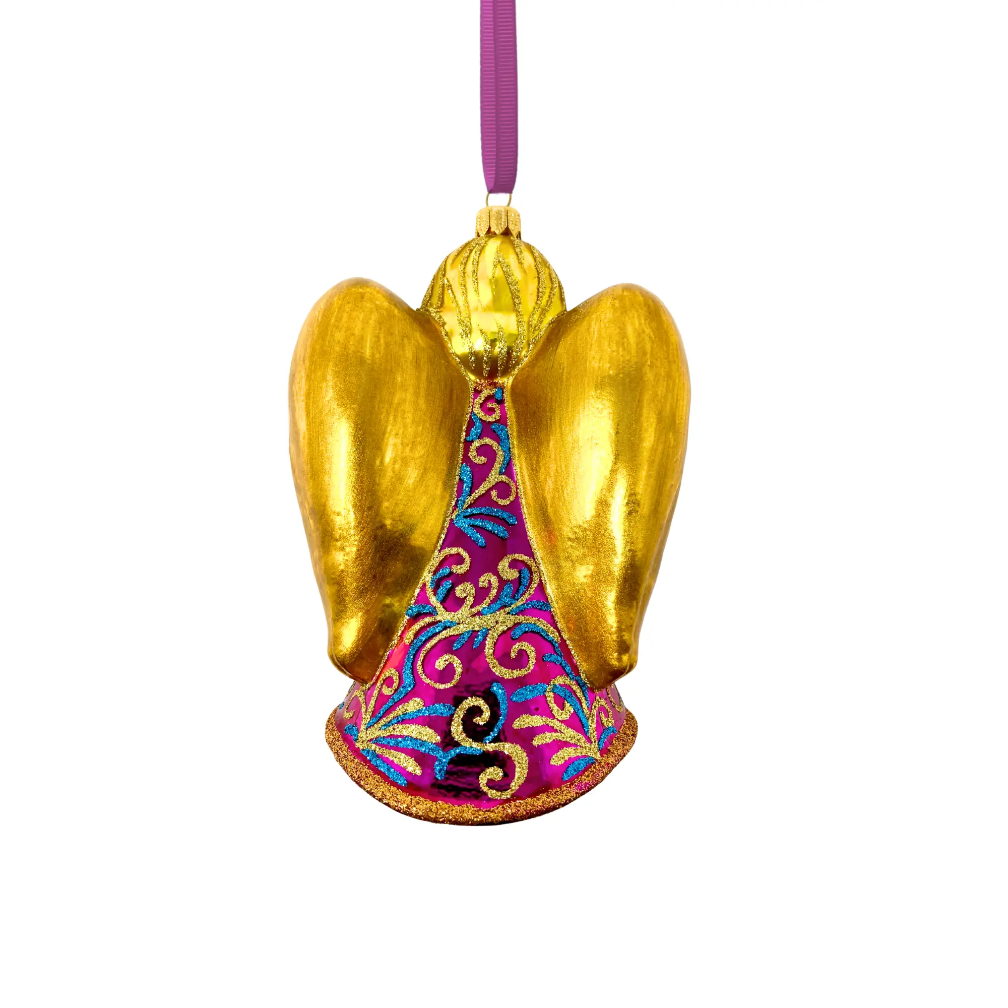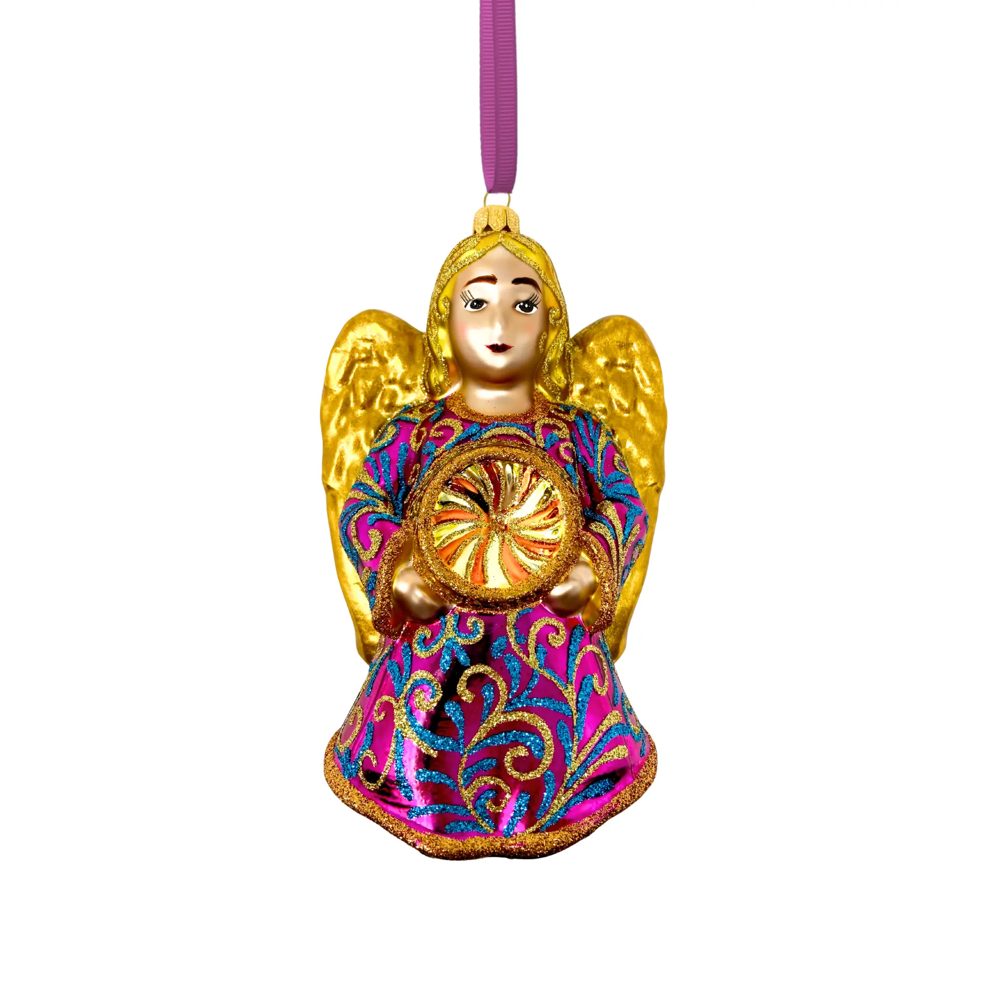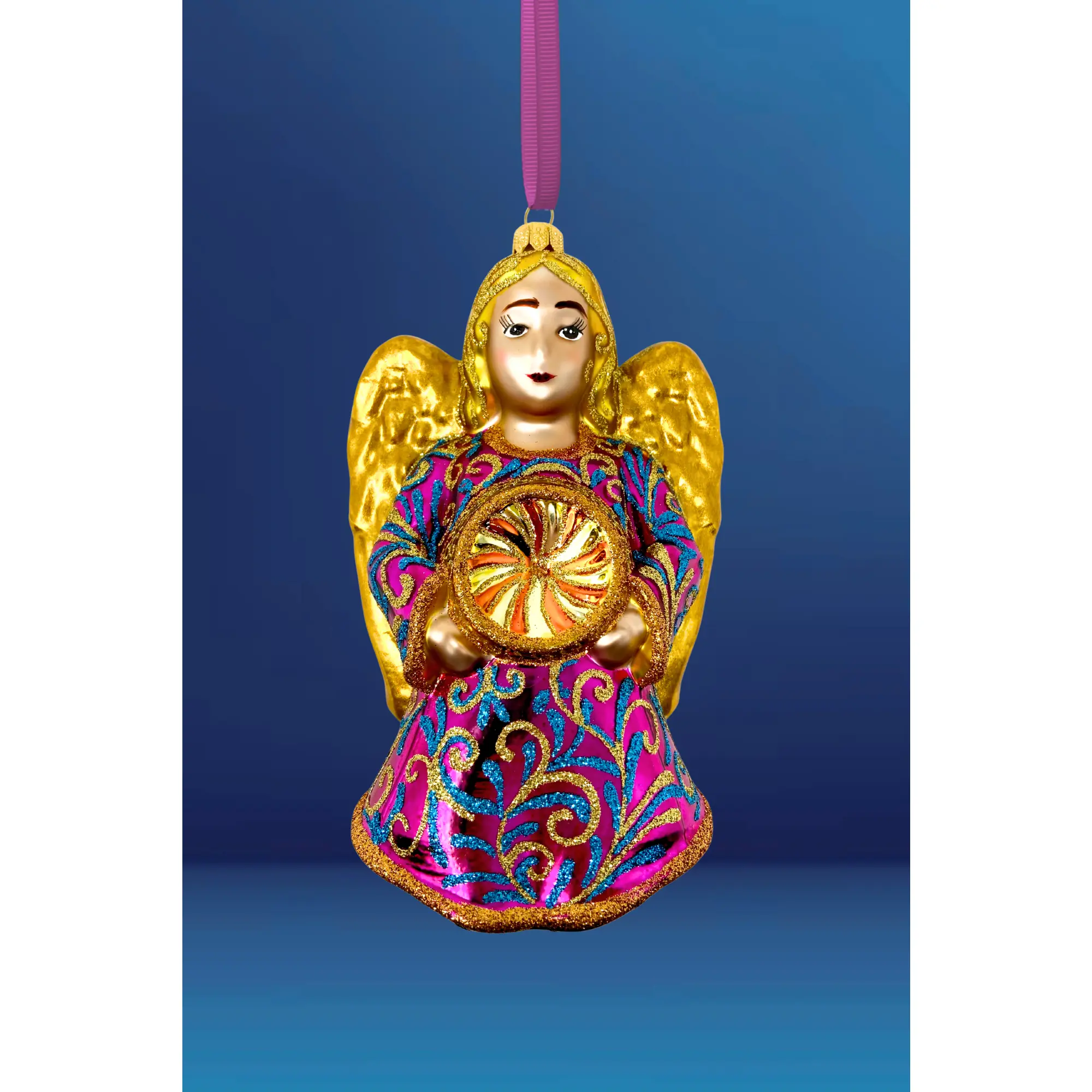 Waves of fuchsia and teal shimmer across her gown, highlighted with delicate golden scrollwork. At her center, the reflector glows warmly, like light gathering in quiet motion. Her presence is soothing yet vibrant. A soft radiance that brings warmth to every branch.