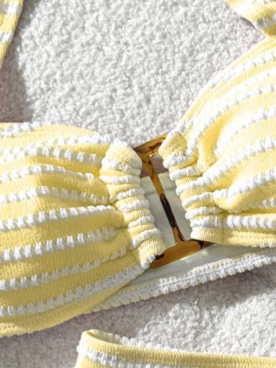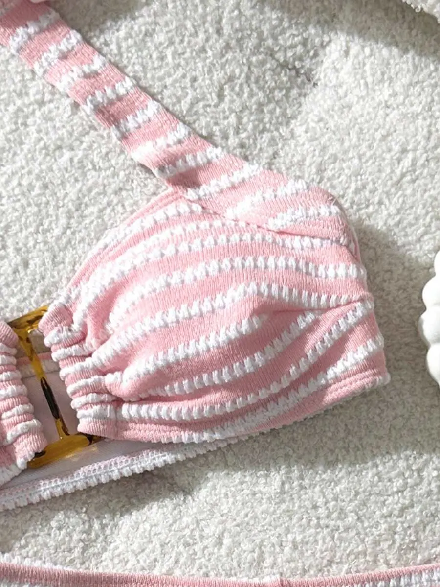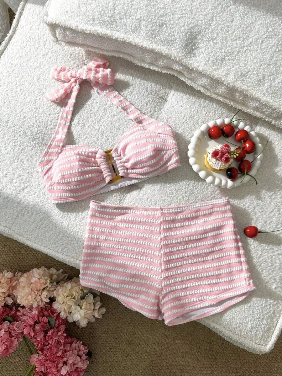 MINSARA Preppy Aesthetic Pink Striped Halter Swimsuit Set For Coastal Vacations And Cute Poolside Looks