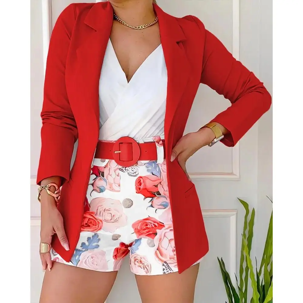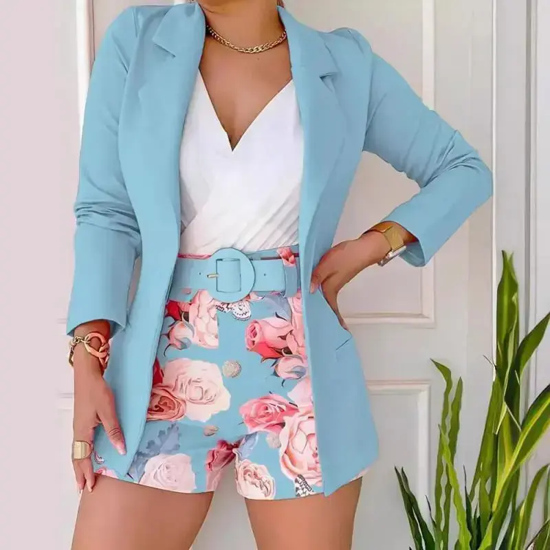 Women's Long Sleeve Blazer & Floral Print Shorts Set With Belt two-piece outfit high waist