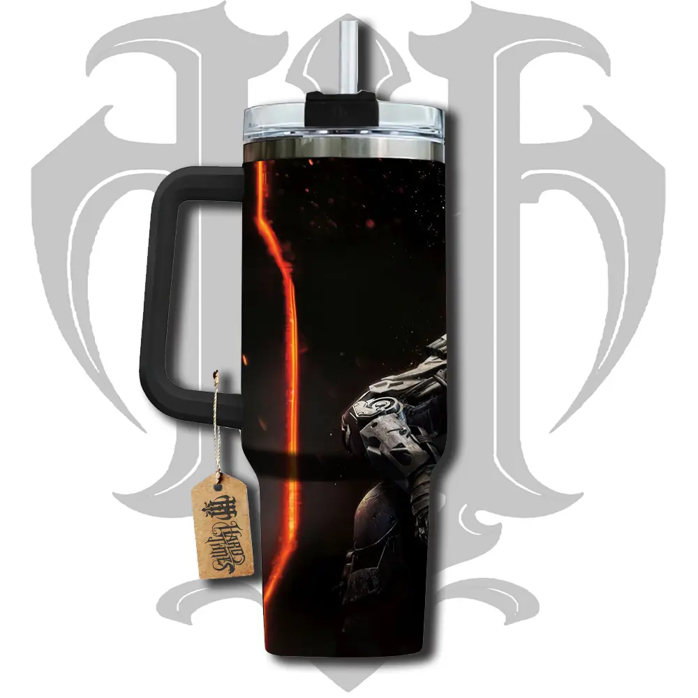 HardTimesMerch - Call of Duty Black OPS 3 #1 40oz Handle Tumbler Stainless Steel Travel Mug, Game Inspired Vacuum Insulated Cup, Large Iced Coffee Tumbler, Manga Fighter Drinkware, Gamer Gift for Him Her