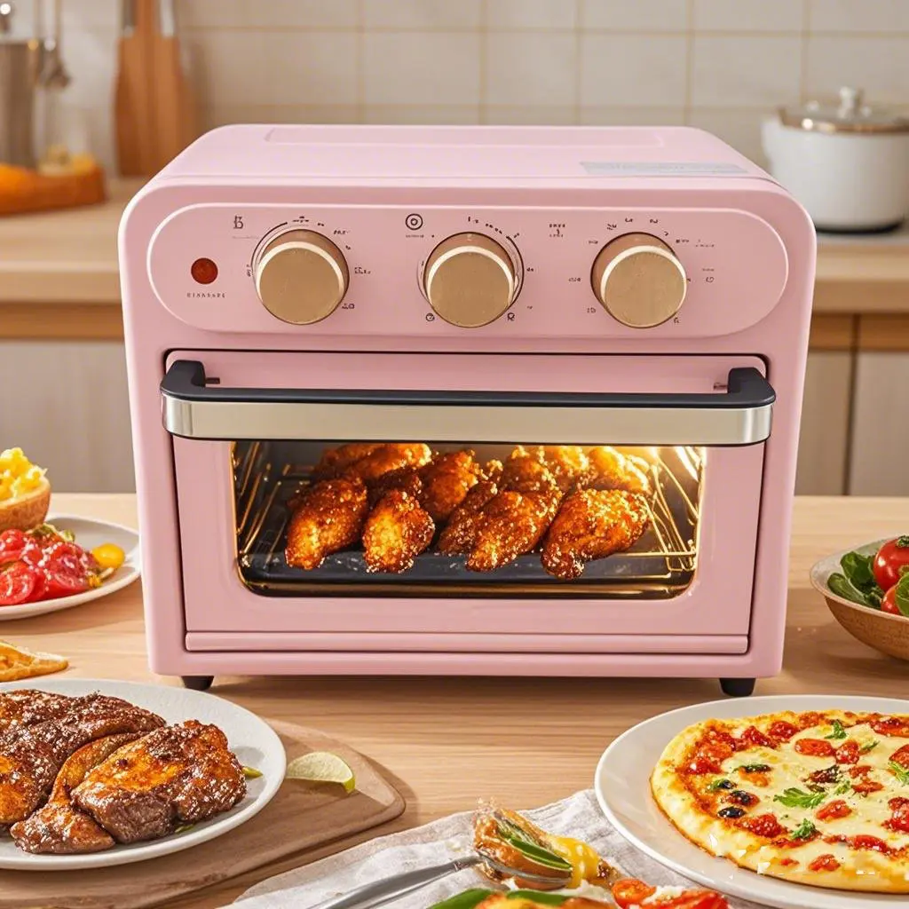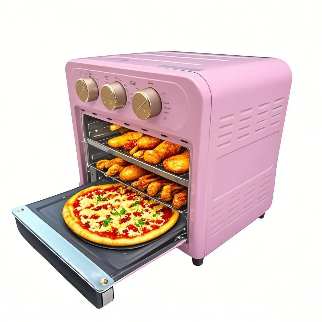 A 15QT convection oven is a multifunctional kitchen appliance. Designed for baking bread, baking, and heating. This model is not suitable for deep frying. Made of stainless steel, it features a clear observation window for easy monitoring. Space-saving design, especially suitable for compact kitchens. With a charming pink design, add a touch of style to your setup. Perfect for a healthy cooking lifestyle.