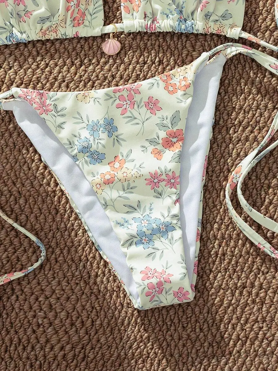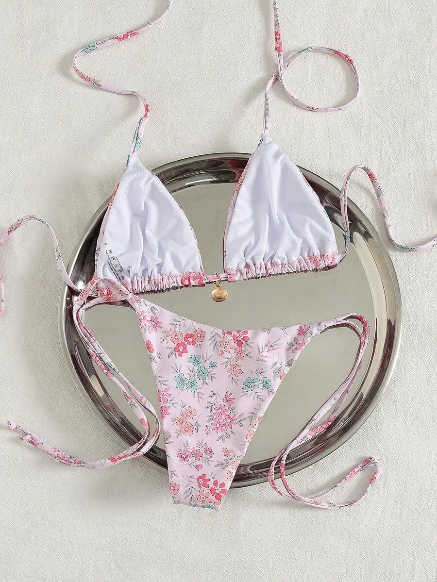 HIBOMARI Multicolor Plant Pattern Fabric Halter Bikini Set Boho Style Lace Up Design