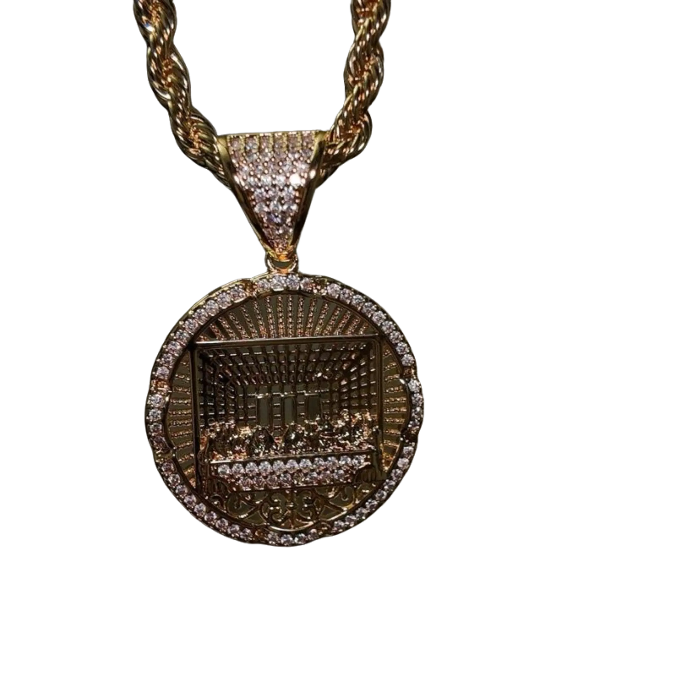 The Last Supper Necklace with a 24-inch rope chain in gold color is a striking accessory. This necklace features a detailed pendant depicting "The Last Supper," surrounded by sparkling stones. The rope chain adds a bold, luxurious touch. Perfect for making a statement.