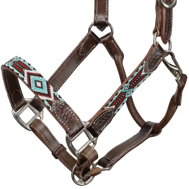 The intricate beadwork is complemented by basketweave tooling on the leather for an authentic Western look. Built for both beauty and function, this halter includes strong hardware and an adjustable crown for a secure, comfortable fit. Perfect for shows, photoshoots, or everyday riding, it’s a standout piece for any horse enthusiast
