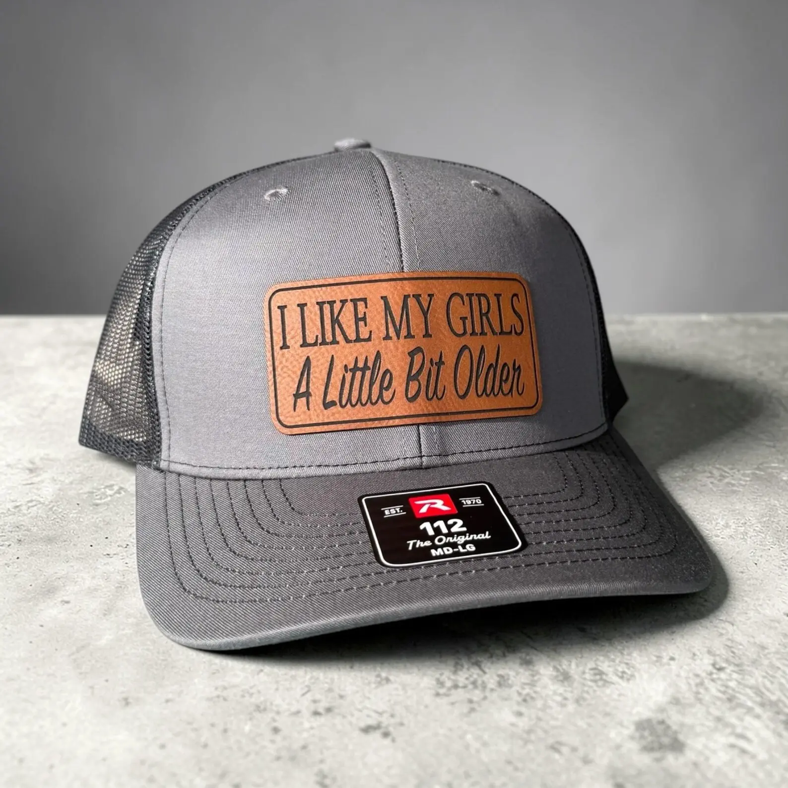 5. Trucker Hat “I Like My Girls A Little Bit Older”, Funny Leather Patch Snapback Cap, Breathable Mesh Back, Viral Humor Gift for Dad, Husband, Casual Style Hat