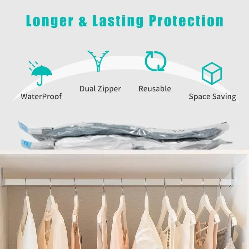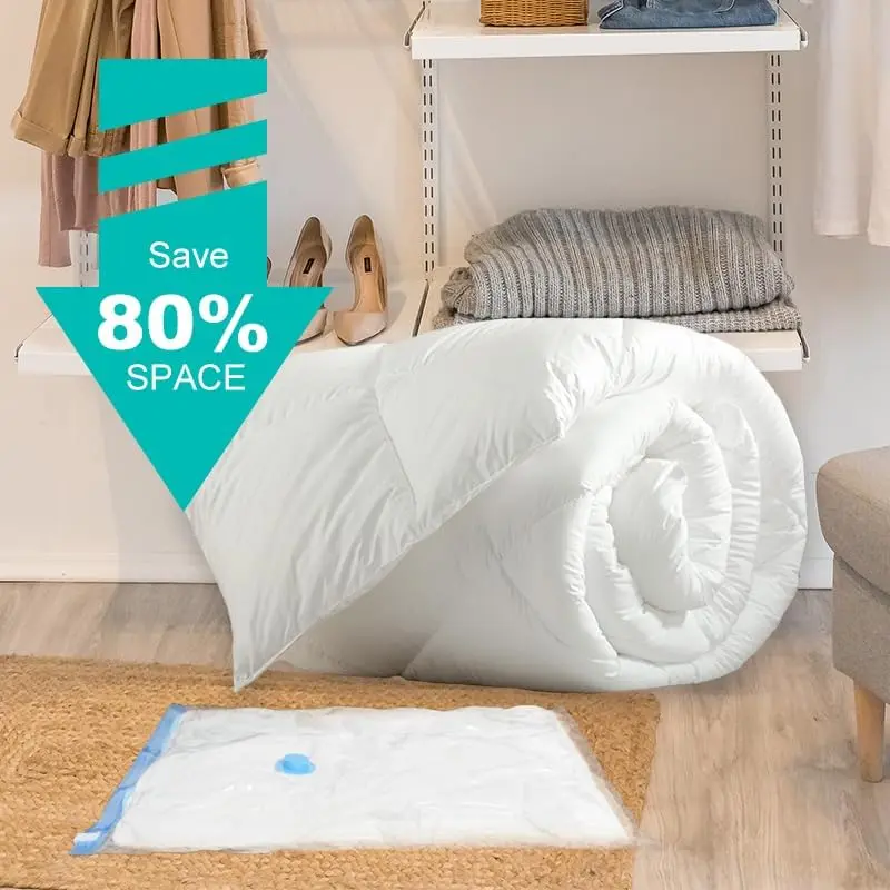 ·80% Space Saver Bags These simple bags can be easily loaded and sealed using a home vacuum cleaner to reduce larger and fluffier articles of clothing like vests and winter coats to their minimum possible size. Vacuum compression bags are also handy for comforters, blankets, duvets, towels, clothes, pillows, linens, plush toys, and more. Our space saver bags are an ideal solution for adding more storage space to your wardrobes, closets, garages, bas