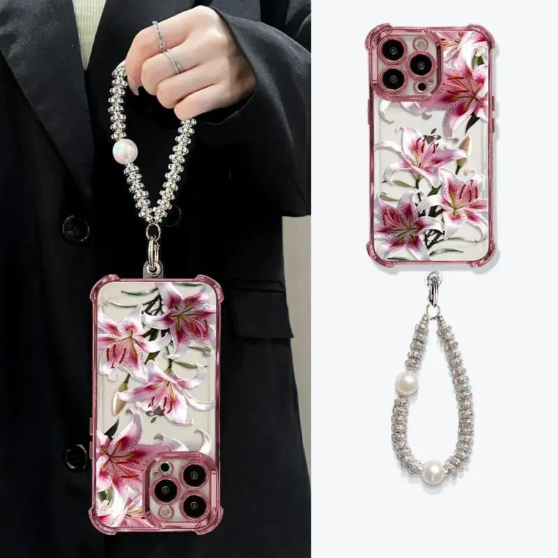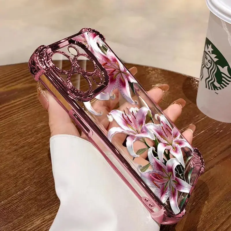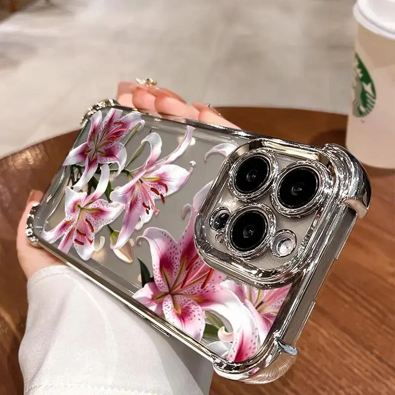 Phone case with pink lily design, compatible with iPhone 11/12/13/14/15/16/17 Pro Max, 14/15/16 Plus, X, & XS Max models, featuring a built-in chrome pink frame and drop protection.
