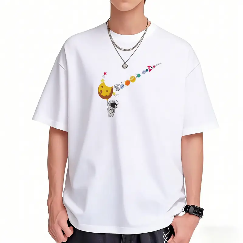 Men's fashionable cotton patterned T-shirt, featuring space planet elements, breathable and comfortable, machine washable, unisex design, perfect for casual summer wear