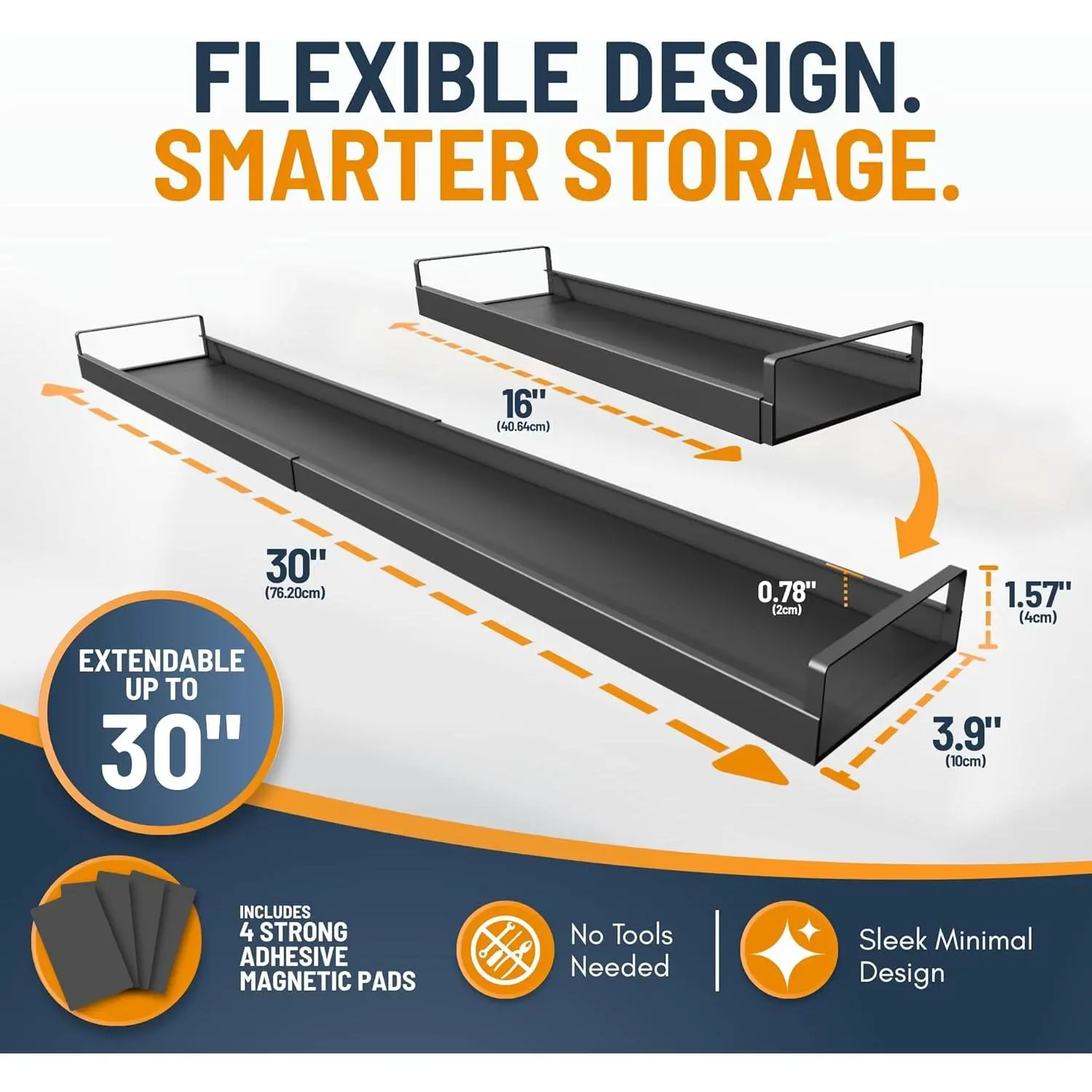 KEEP ESSENTIALS WITHIN REACH: Transform unused space into functional storage with our extendable steel magnetic stove shelf. Designed for strength and stability, it provides a secure spot for condiments, spices, oils, and décor - keeping your essentials neatly organized and always within reach. Declutter your cooking area and elevate your kitchen with a sleek storage solution that blends convenience and style. ADJUSTABLE SIZE FOR A PERFECT FIT: Our extendable oven shelf for top of stove extends from 16" to 30" in length with a 3. 9" width, allowing you to customize the fit to suit your stove. Designed for flat stoves - it ensures a seamless, built-in look. Please measure your stove before ordering to confirm our above stove shelf is compatible for your range. QUICK & EASY INSTALLATION: No tools or drilling required! Our extendable magnetic shelf for stove comes with 4 heavy-duty adhesive magnets that securely attach to our over the oven shelf, providing a strong, magnetic hold without causing damage. For non-magnetic stoves, we include 4 adhesive stickers, ensuring compatibility with any setup. Simply peel, stick, and place the over stove spice rack organizer for a hassle-free setup that stays firmly in placeWHAT SETS US APART: Unlike flimsy, low-quality alternatives, our over the stove shelf rack is crafted from premium, sturdy steel for long-lasting durability. The sleek extendable design (up to 30") adapts to your stove for a built-in look, while raised ridged sides keep your kitchen essentials safe and secure during cooking. Engineered for strength, stability, and style - a reliable upgrade that keeps your stovetop tidy and organizedAMERICAN BRAND QUALITY: As a trusted family-owned business who stands behind the quality of their products, Linda’s Essentials is proud to serve over 5 million happy customers. Should you encounter any questions or troubles, please reach out to us and we’ll make it right!