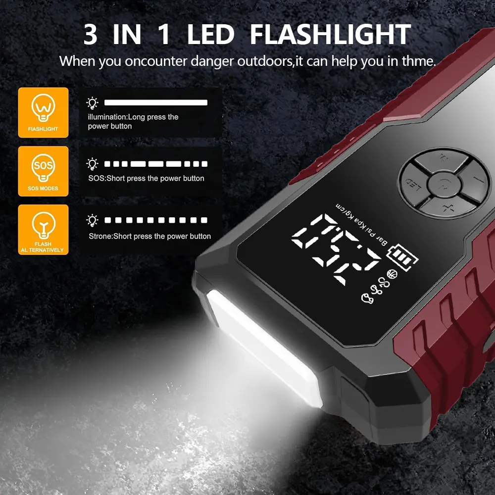 When darkness falls, the integrated LED light comes to the rescue. It offers three modes: high brightness, low brightness, and SOS strobe. The high-brightness mode delivers up to 400 lumens, lighting up your surroundings for car repairs or camping. The SOS strobe mode sends out emergency signals, ensuring you're visible in critical situations. With its durable construction, the light withstands harsh weather conditions, making it a reliable companion for any emergency.
