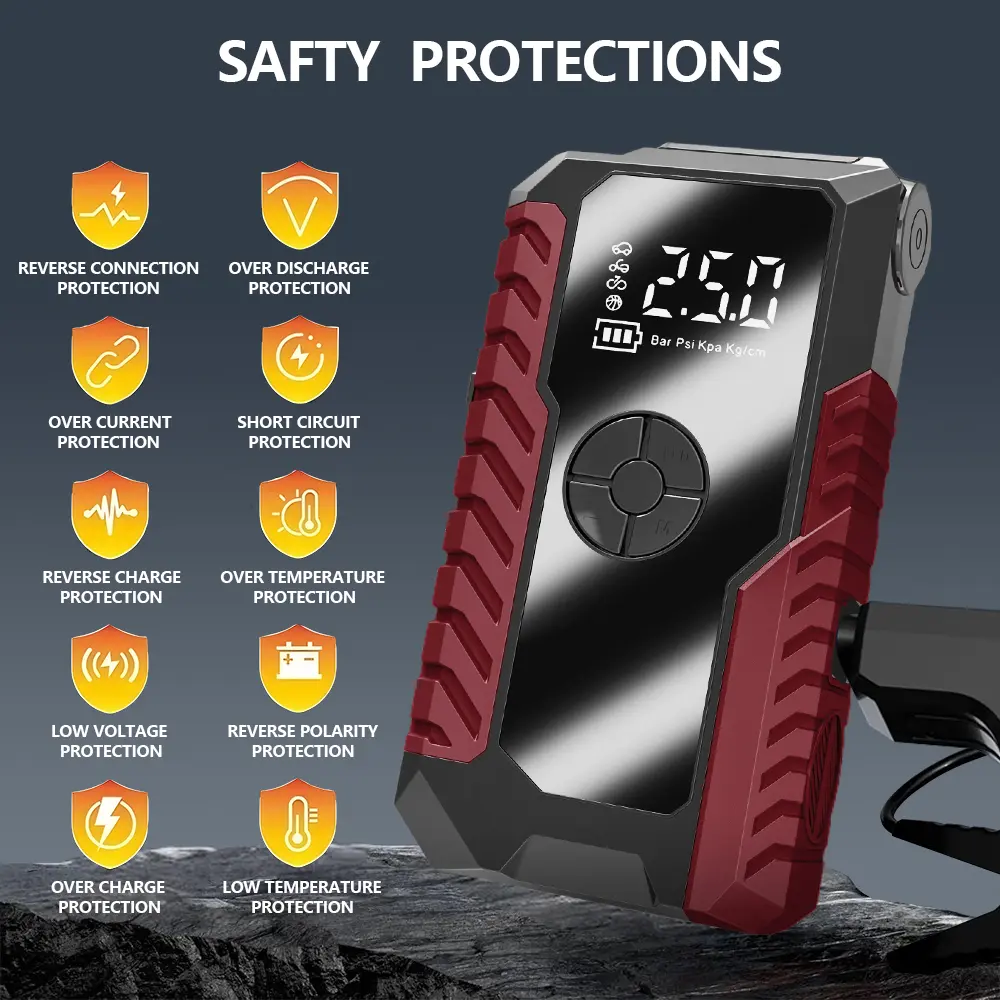Your safety is our top priority. The jump starter is equipped with 10 built-in safety protections, including over-voltage protection, under-voltage protection, over-current protection, short-circuit protection, and reverse polarity protection. These features ensure safe operation for both you and your vehicle. Additionally, it has passed CE and FCC certifications, meeting international safety standards..