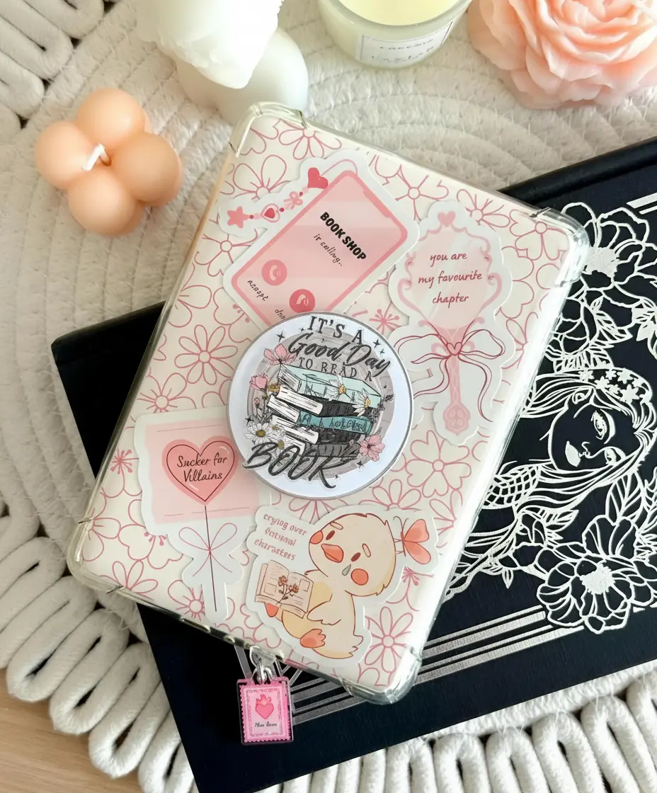 Cute Floral Book Stack Kindle Grip - Magnetic eReader Grip Stand - Book Lover Accessory