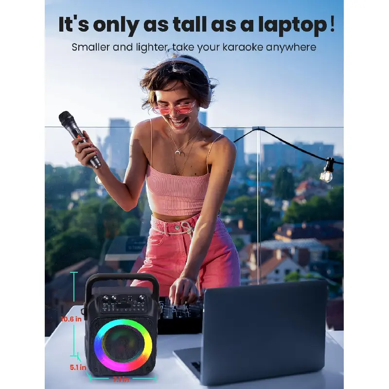 5. Karaoke Machine with Two Wireless Microphones, Portable Karaoke Machine for Adults & Kids, Portable Bluetooth Speaker with PA System, LED Lights, Supports TF Card/USB, AUX in, FM, USB,TWS (Black)-
