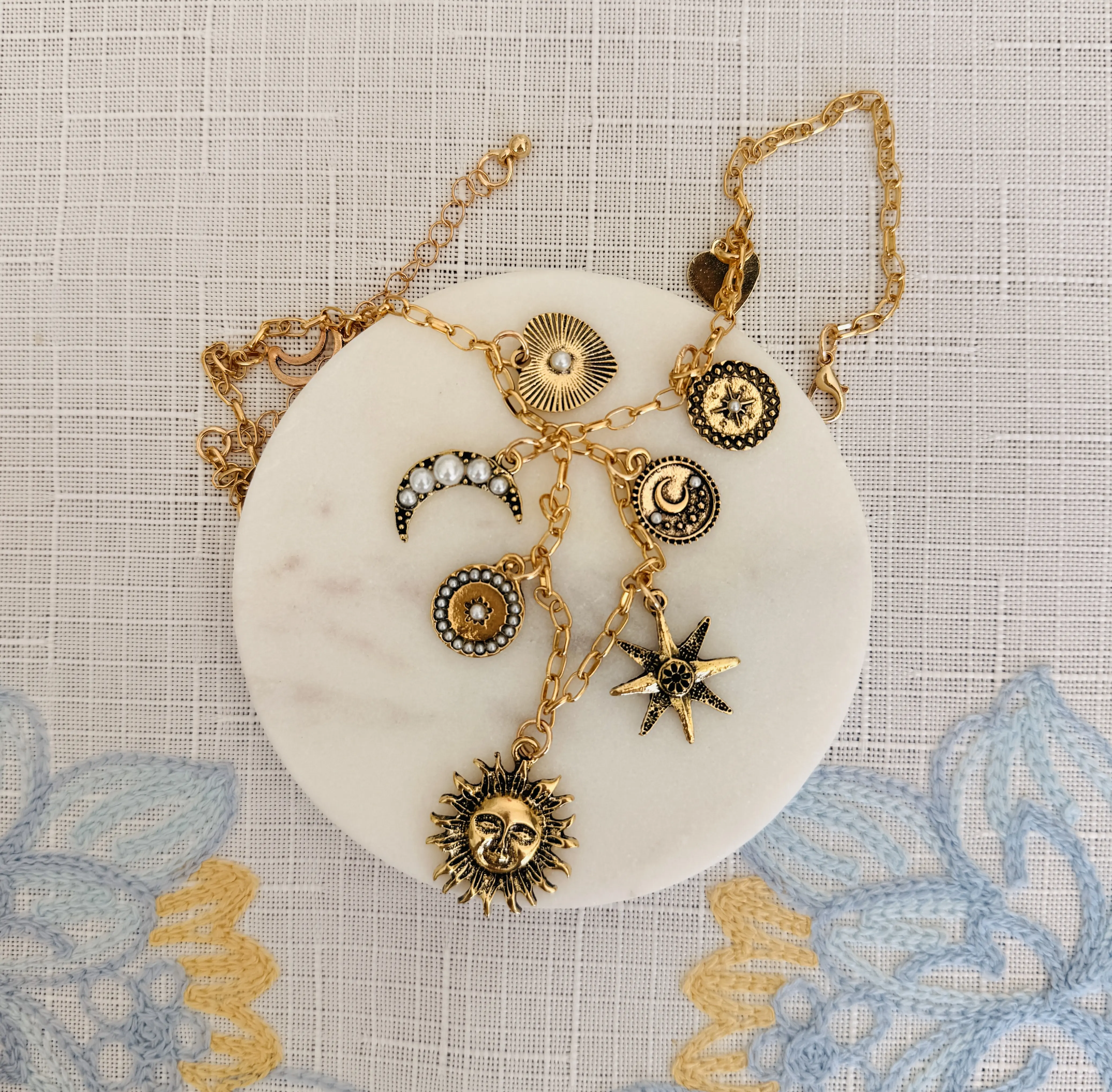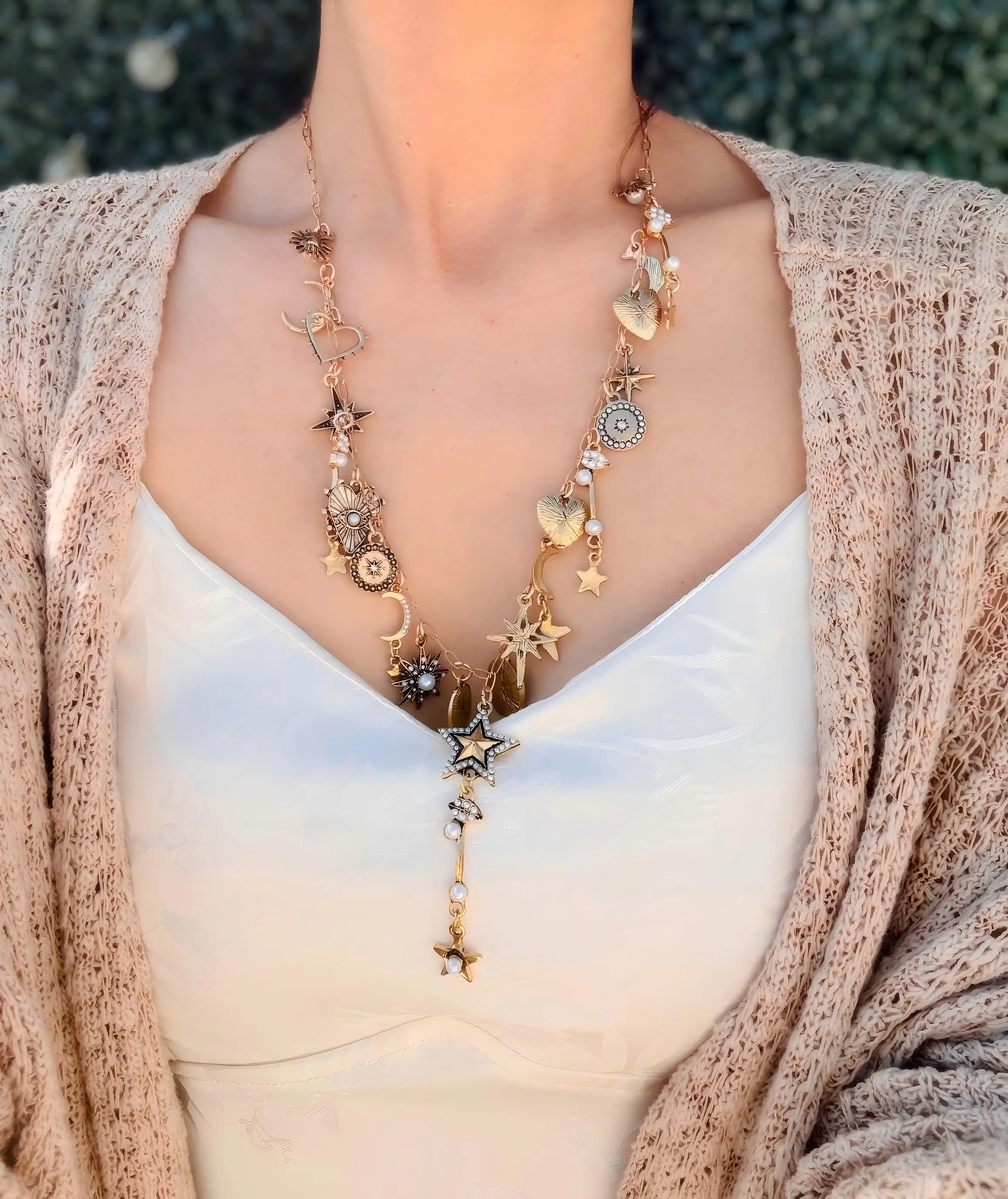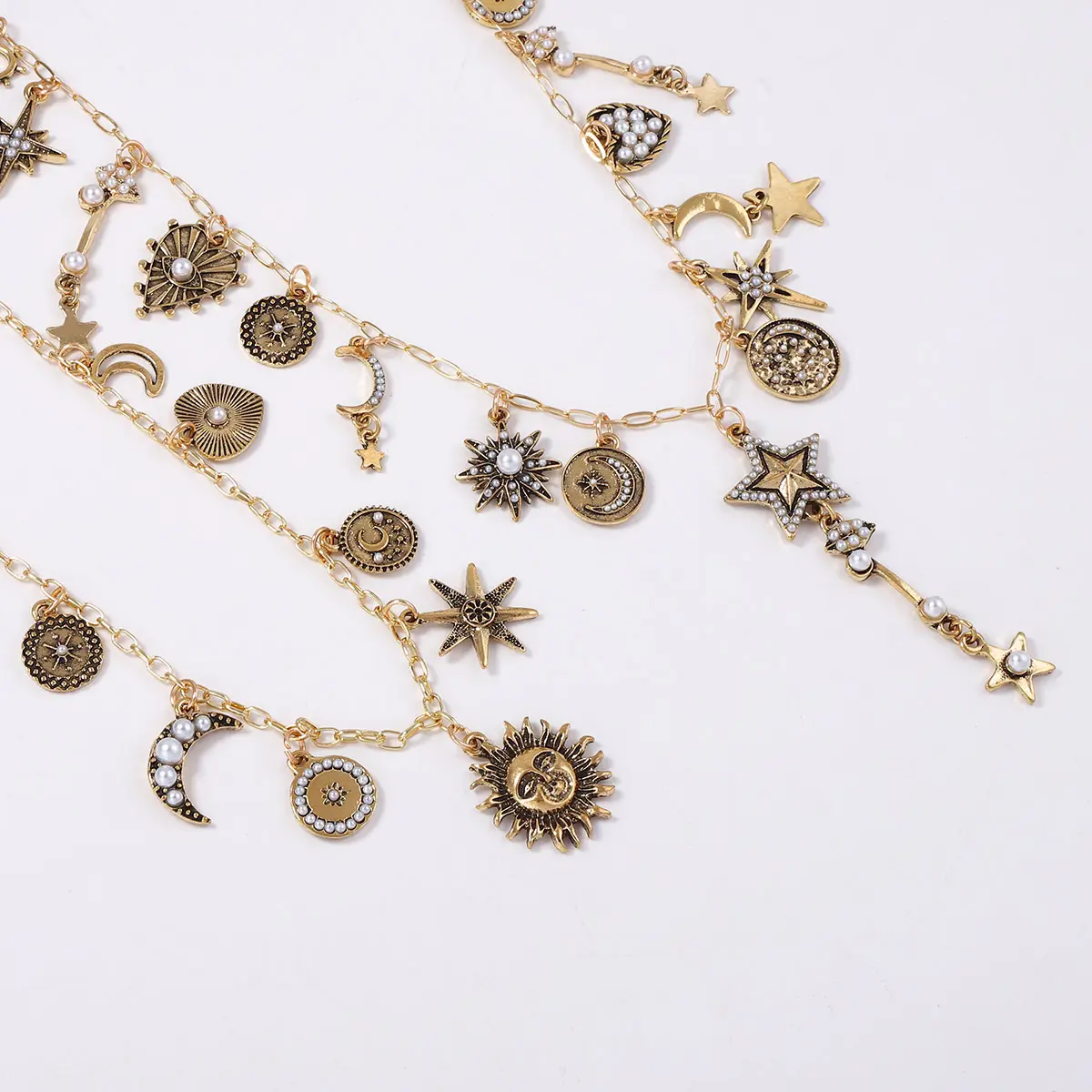 Double-layered stacked design, unique celestial theme, combined with cosmic elements including sun, stars, moon and heart. Embellished with pearls and rhinestones, full of stylish atmosphere. The vintage gold tone shows a retro sense, forming a gentle contrast with the shine of rhinestones and pearls.