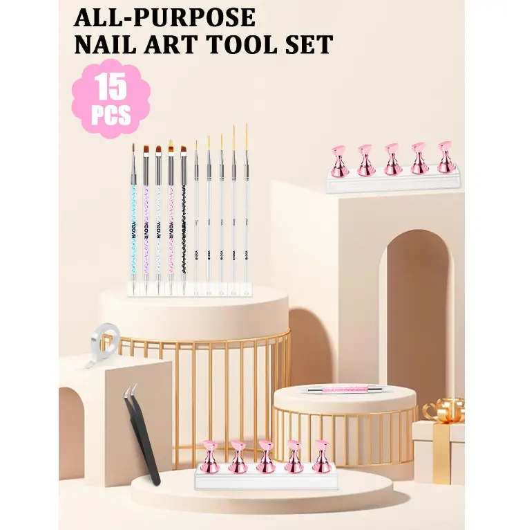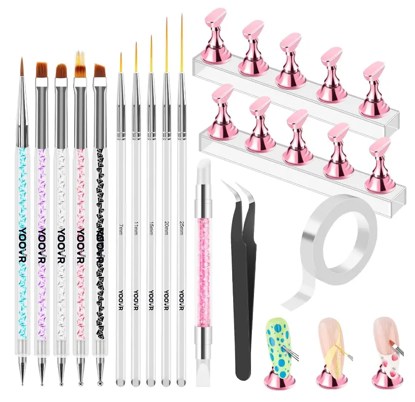 ·Salon-Grade Nail Design Tools – For Endless Manicure: This set includes 5 dual-end nail art brushes with dotting tools, delivering 10 functions in total. 5 precision liner brushes, 1 dual-ended silicone embossing pen, 1 metal angled tweezer, 2 magnetic 5-in-1 nail stands and double-sided mounting tape. Everything needed for home manicures to professional nail art—no missing essentials!