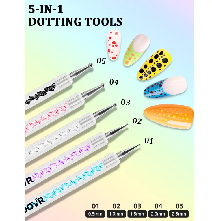 ·2-in-1 Dual-Ended Design – Double your creativity: Each dual-end brush pairs a dotting tool (0.8/1/1.5/2/2.5mm) with specialty brush heads: flat, round, angled, blender and detailer. Create gems, gradients and cuticle work effortlessly. The ultimate space-saving toolkit for 3D art and embellishments! Silicone embossing pen creates delicate florals and patterns.