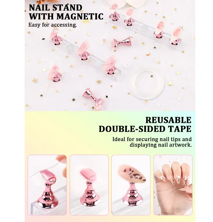 ·Smart Magnetic Nail Stands – For Convenience Painting: The magnetic nail stands work as nail tips holders, drying racks and display stands. Strong magnets keep tools secure and detachable design for easy adjustment, while the nano tape ensures wobble-free adhesion—making solo or salon manicures 10x easier.