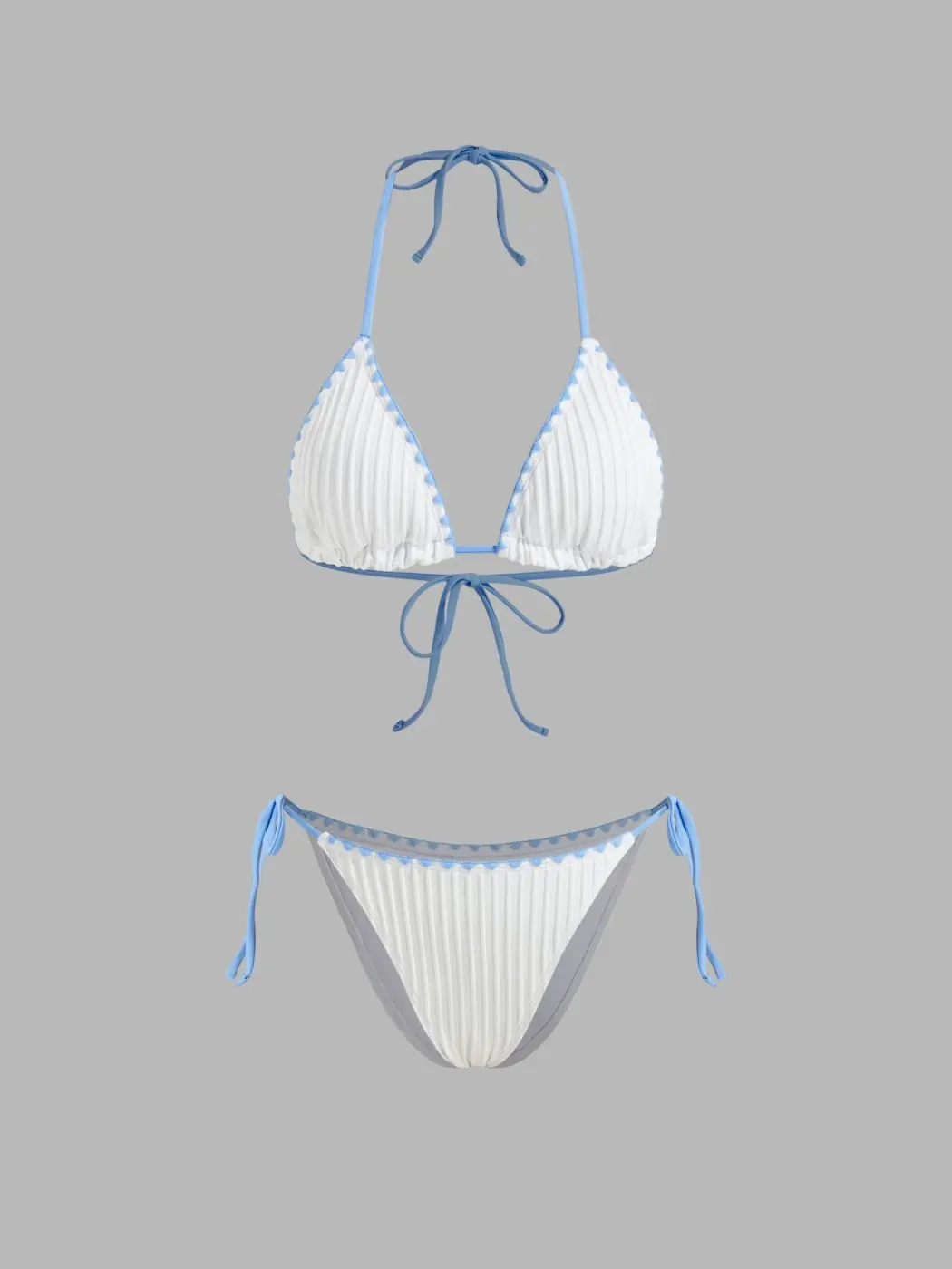 Rib Halter Neckline Contrasting Binding Triangle Bikini Set & Floral Cover Up Skirt
