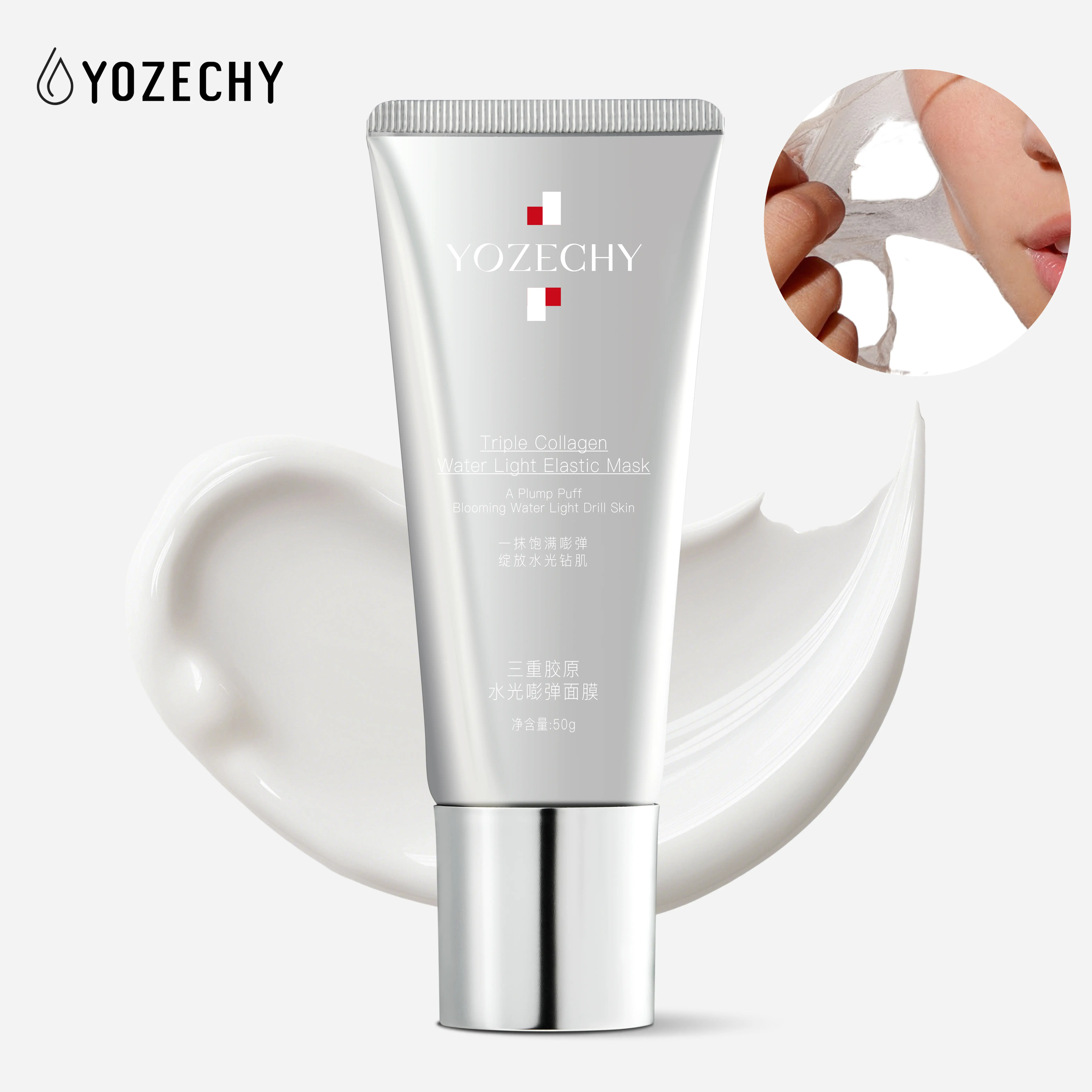 YOZECHY Triple Collagen Bouncy Mask features breakthrough film-forming technology - melting from a creamy white emulsion into a weightless, invisible film that lifts as it sets. Every step: skincare ritual meets visible transformation.