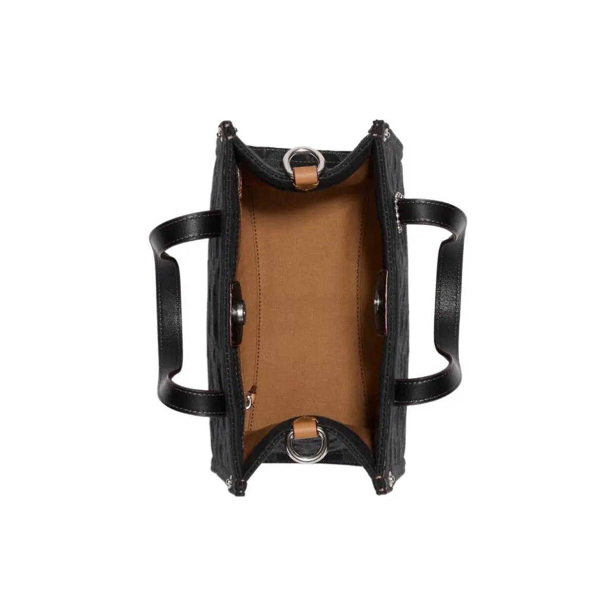Materials: Exterior combines premium textured cotton toile jacquard (recycled content included) with smooth, full-grain cowhide leather trim and hardware. Lining is soft, durable polyester twill with COACH branding.