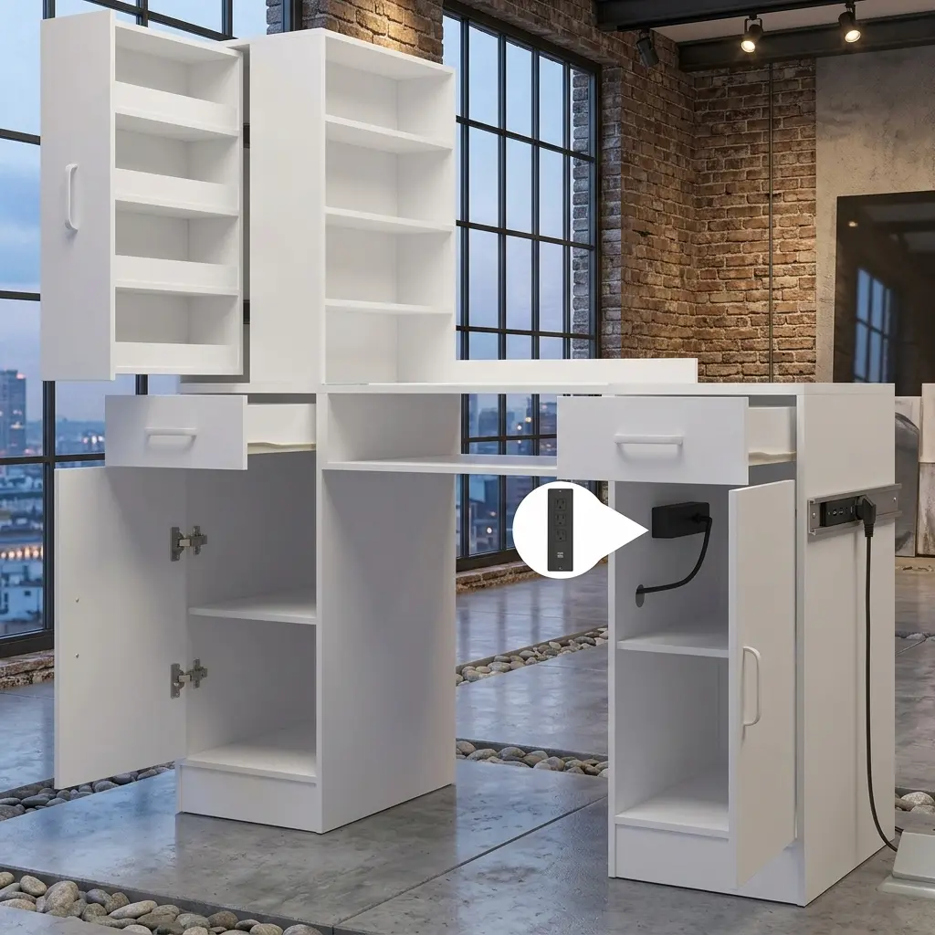 ✅Built-in Power Outlet for Convenience: Featuring a built-in power outlet, this nail desk allows you to use multiple devices simultaneously.Power your phototherapy lamps, electric polishing machines, desk lamps, and other nail tools all at once, eliminating the hassle of insufficient sockets or tangled wires.