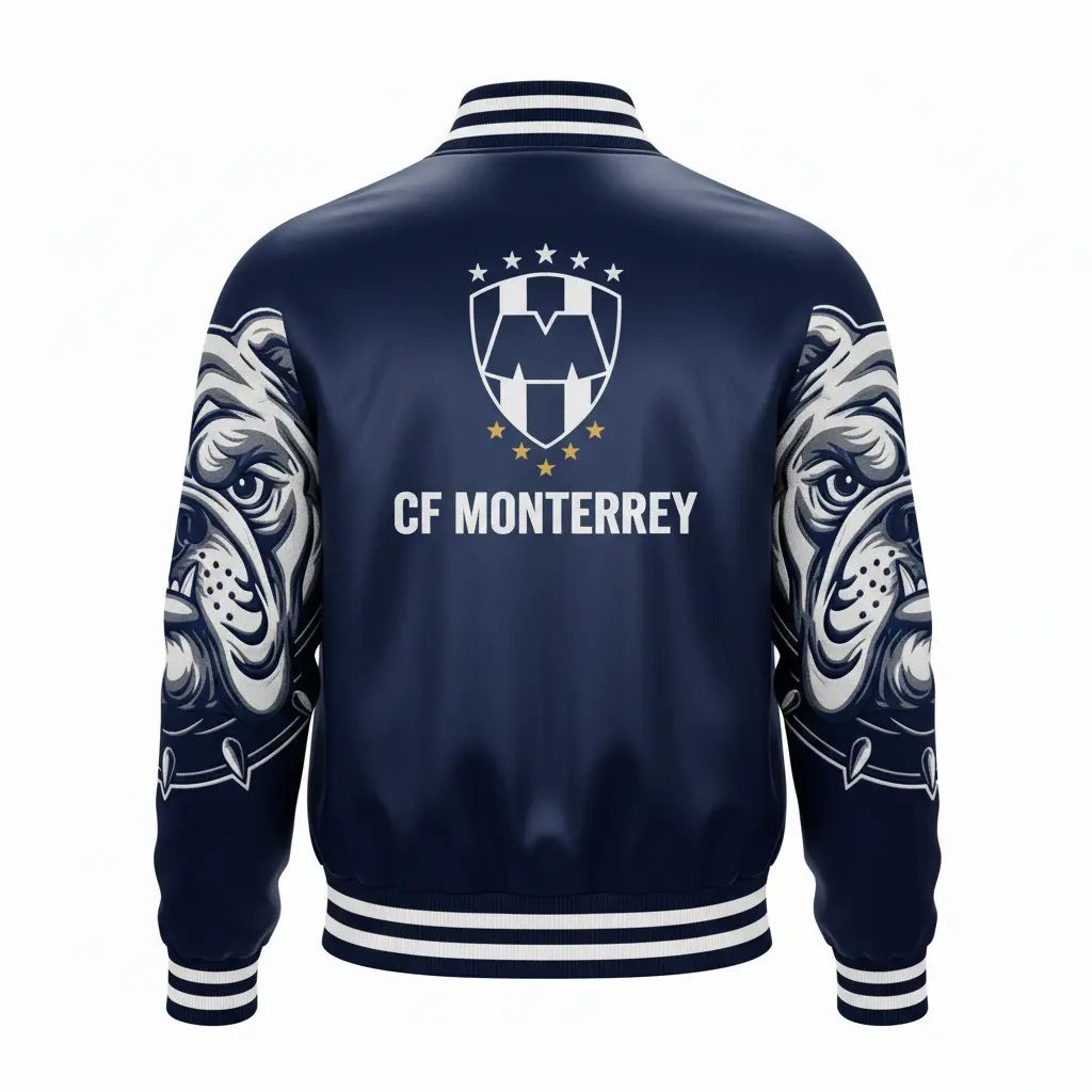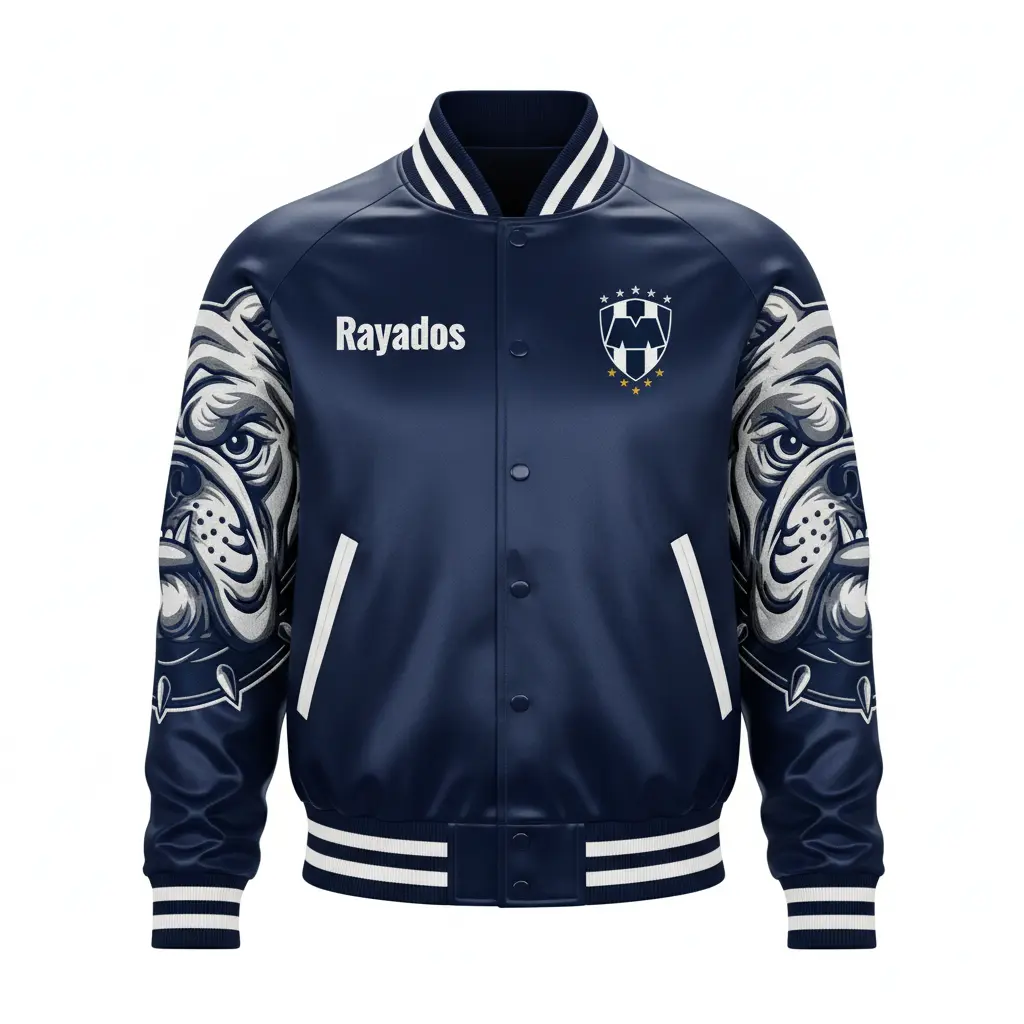 Monterrey Varsity Jacket English Bulldog Mascot Concept – Rayados Satin Polyester Streetwear