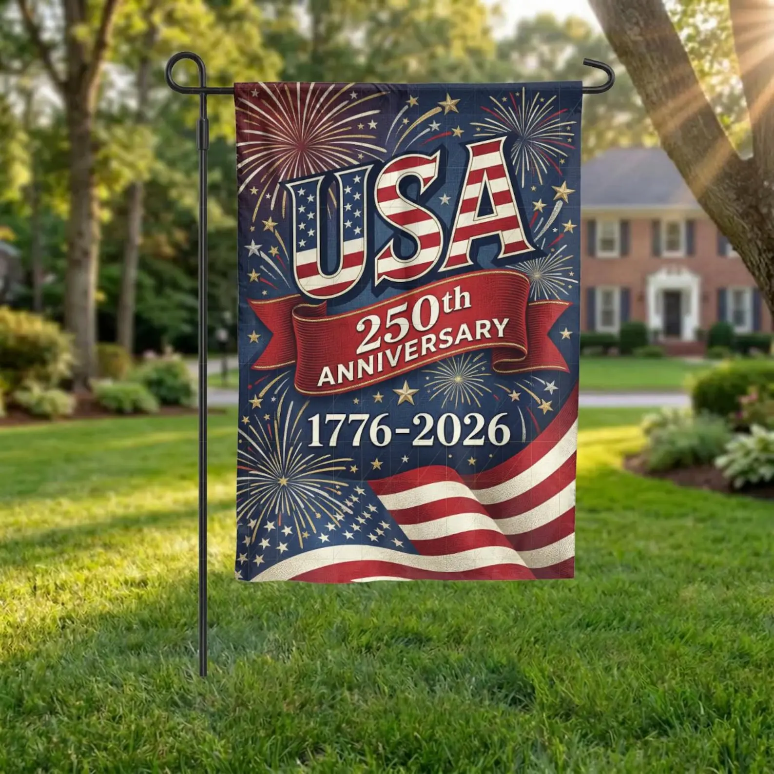 USA 250th Anniversary Garden Flag, 1776-2026 Patriotic Outdoor Decor, American Semiquincentennial Yard Banner, Fireworks & Flag Design