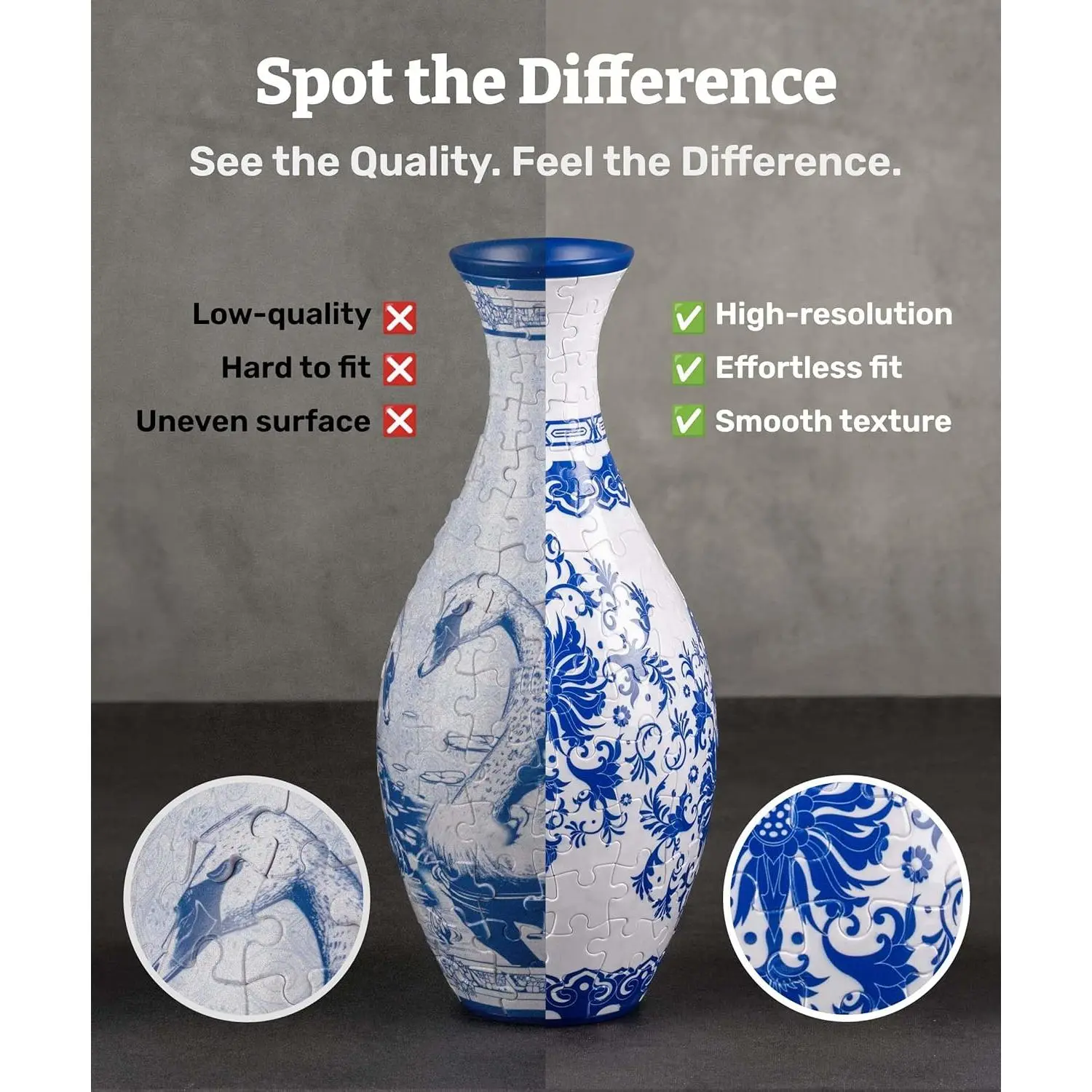 Pintoo offers innovative material and user experience different from cardboard puzzles, which are featured: Snug interlock, Zero puzzle dust, Easy to move, Ready for a frame, and Easy storage.