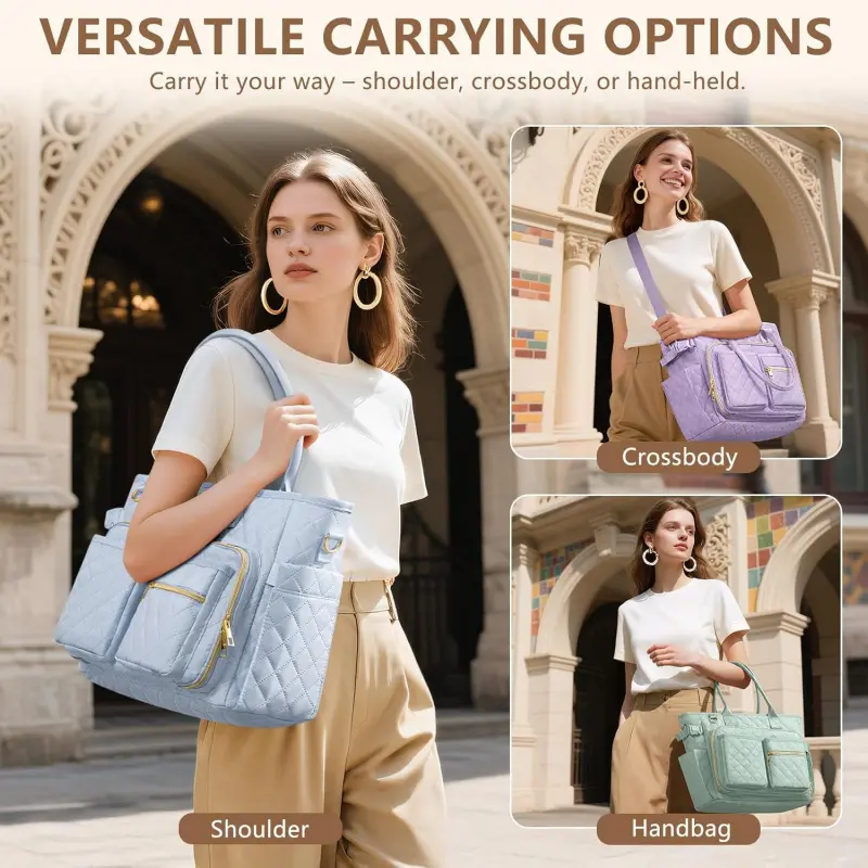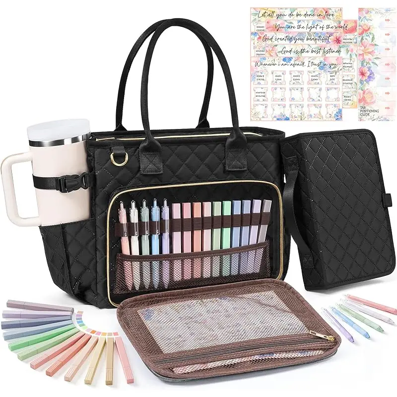 MEANINGFUL CHRISTIAN GIFTS FOR WOMEN FAITH: Looking for a stylish and special Christian gift for women? Surprise her with the FLOE Large Bible Bag, complete with a bible cover case and Bible study supplies-a blend of elegance, practicality & faith. With its soft-touch feel & timeless design, it makes a thoughtful gift for any occasion-Christmas, Mother’s Day, Thanksgiving, birthdays, Easter, Valentine's Day, Teacher's Day. Ideal as religious, Catholic, spiritual, baptism or Bible gifts for womenALL-IN-ONE BIBLE STUDY SUPPLIES: The FLOE Bible bag for women is the ultimate bible journaling kit, includes everything you need for Bible study-1 Large Bible tote bag, 1 Bible cover case, 1 shoulder strap, 12 Bible highlighters, 5 black gel pens, and 75 Bible tabs with tab positioning guide. Every detail is thoughtfully designed to make Bible journaling more enjoyable and inspiring. A unique gift for mom sister friend wife or grandma, this Bible study kit is a heartfelt gift she’ll truly enjoyLARGE CAPACITY BIBLE BAG FOR WOMEN: Our Chic Bible Carrying Case measures 13. 6"x 5. 3"x 10. 8", combining spacious storage with a portable design to keep your essentials organized wherever you go. Large enough to hold Bibles of various sizes, it also fits a 14'' laptop or 12. 9'' iPad, making it as practical for study, work or daily use. Doubles as a bible bag, church tote bag, work bag, laptop bag, travel bag, nurse bag, makeup bag & toiletry bag-a versatile all-in-one solution for women on the goMULTI-FUNCTIONAL COMPARTMENT: This Bible cover case for women church bag offers ample storage with a padded 14" laptop sleeve, ample main section, zip & open pockets inside and out, deep side pockets, back pocket & a large front zip compartment with 15 pen slots & a mesh zip pouch. Easily fit laptops, bible books, phone, headphone, pens, bible tabs, water bottle & umbrella. With quick-access exterior pockets and secure zip sections, this tote bag for women bible carrier keeps your valuables safeSHIELD YOUR BIBLE IN STYLE: The large bible case for women is made of quilted waterproof fabric with smooth gold-tone zippers & sturdy handles for style and function. The unique D-ring lets you hang sunglasses, keys or other small items for easy access. Thick padding and reinforced stitching protects your Bible and bible journaling supplies like a shield, while the roomy interior of bible tote bag book case holds bookmarks, prayer journals, church bulletins, prayer cards, sermon notes, and moreOVERSIZED TUMBLER SIDE POCKET: Oversized water bottles? No problem-this women’s Bible bag work tote bag handles them with ease! Featuring a deep left-side pocket with a secure buckle, it easily fits 40oz tumbler or large water bottle. The buckle ensures your tumbler stays in place, providing spill-free storage and quick access. Whether you’re heading to church, office, gym, nursing or traveling, this quilted tote bag for women bible book carrying case keeps your tumbler safe & within reachULTIMATE BIBLE STUDY KIT: Each Bible bag has a detachable Bible cover to protect against dust, spills & page damage, extending your Bible’s lifespan. The upgraded size of bible cover for women book cover case fits most M/L size Bibles up to 10. 2"x6. 9"x2. 4". Pens & Bible highlighters write smoothly and won’t bleed, and Bible tabs with a positioning guide make finding scriptures easy. Bible study supplies let you highlight, take notes & personalize your Bible for a more organized, inspiring studyFAITH & LIFE CARRYALL TOTE BAG: The versatile Christian gifts for women Bible cover case comes with an adjustable & detachable shoulder strap, allowing the quilted bible tote bag to be used as a shoulder bag, crossbody, or handbag. More than just a Bible bag, it doubles as a briefcase, Bible carrying case, church bag, teacher bag, laptop bag, work bag, nurse bag, gym bag, beach bag or travel bag. Perfect as Christmas Birthday Gifts for Bible lover, teacher, nurse, busy mom, commuter, or travelerCHIC & REFINED: Designed especially for women, this exquisite Bible bag enhances her look with a touch of grace and unique style. Whether at church, work or on the go, it helps her stand out effortlessly while capturing every chic moment. Thoughtful Christmas gifts, Mother’s Day gifts, Valentine’s Day gifts, Christian gifts, Thanksgiving gifts, birthday gifts or Teacher Nurse Appreciation gifts for women mom, wife, grandma, sister, friends & teacher that are a heartfelt expression of love & care