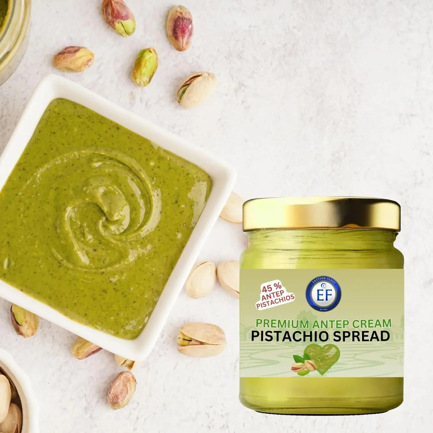 ·Indulge in the rich, creamy goodness of Eastern Feast Premium Antep Pistachio Spread. Made with 45% real pistachios, this luxurious spread delivers an authentic taste. The smooth, spreadable consistency makes it perfect for breakfast toast, pastry fillings, or as a delightful addition to your dessert creations. This versatile 7 oz jar of pistachio cream can transform ordinary snacks into extraordinary treats. Its natural pistachio-green color and rich nutty flavor make it an irresistible choice for both casual enjoyment and special occasions. Whether you're spreading it on bread, using it as a dip, or incorporating it into your favorite recipes, like Dubai Chocolate this premium spread brings the distinctive taste of high-quality pistachios to your table. Store in a cool, dry place and refrigerate after opening to maintain its fresh, premium quality.