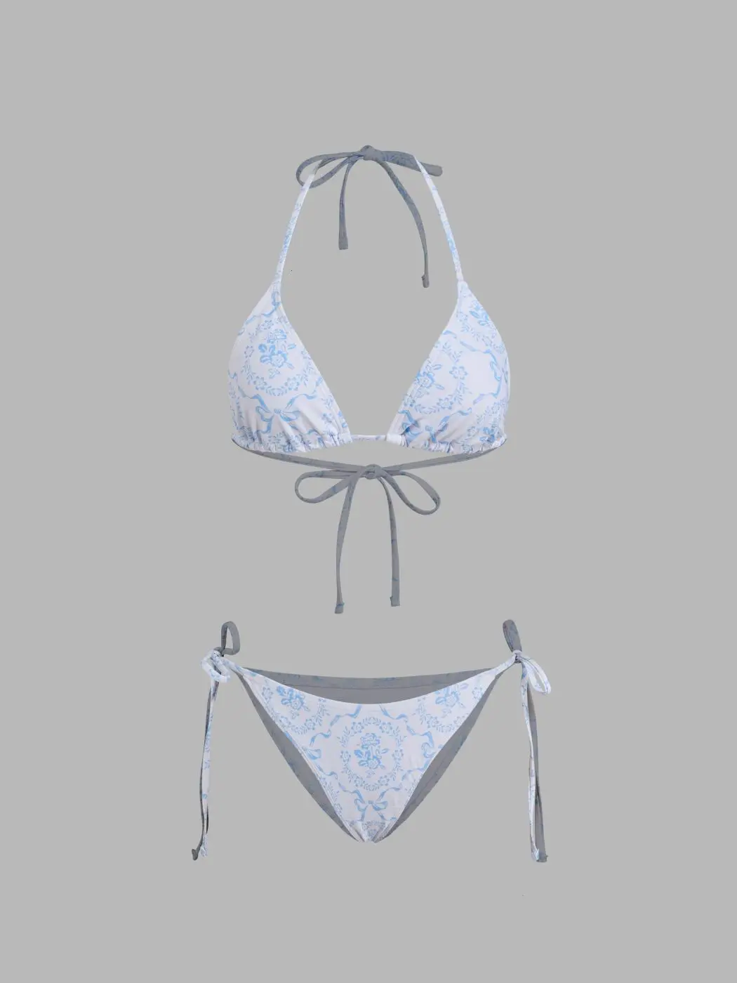 Rib Halter Neckline Contrasting Binding Triangle Bikini Set & Floral Cover Up Skirt