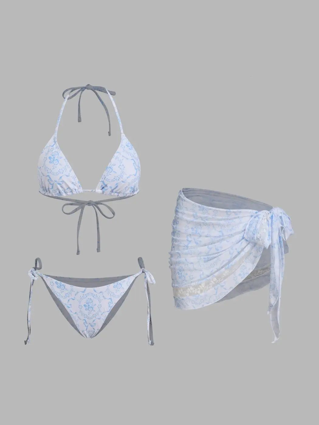 V-neck Bowknot & Flower Knotted Halter Tie Side Bikini Set With Lace Sarong