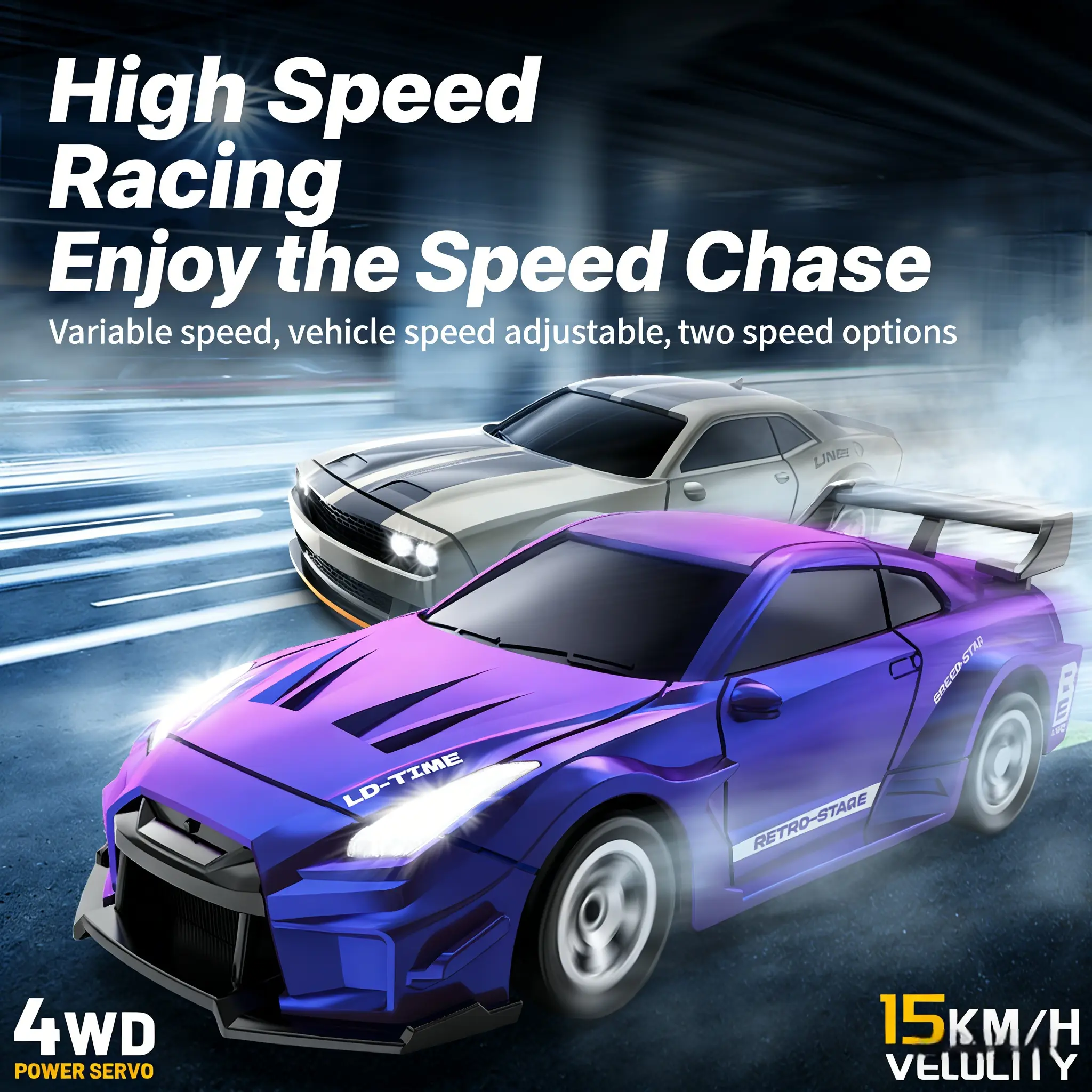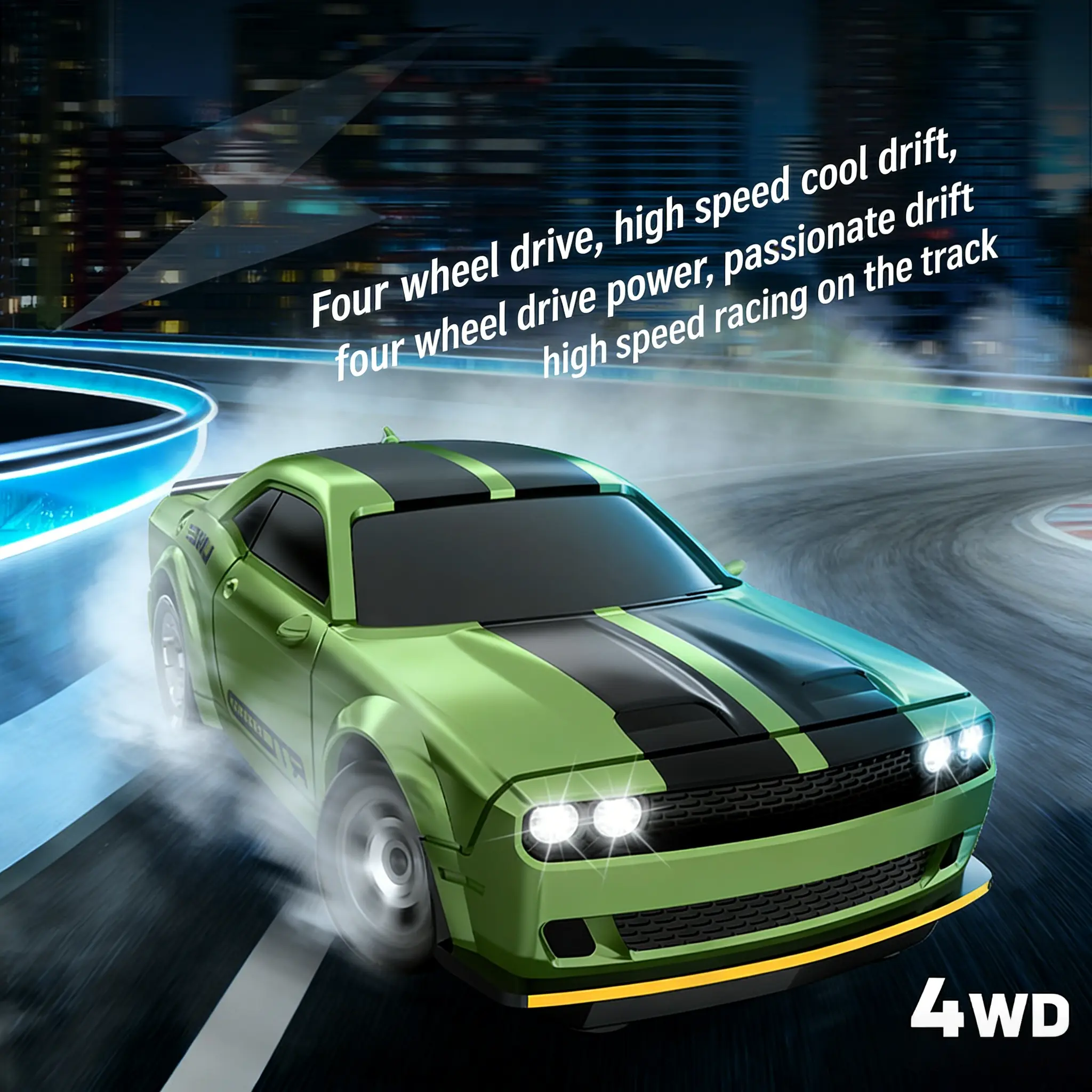 Powerful 4WD High-Speed Drift PerformanceFull 4-wheel drive system delivers unbeatable traction and responsive handling, for sharp turns, seamless drifts, and blazing fast races on almost any indoor/outdoor surface.