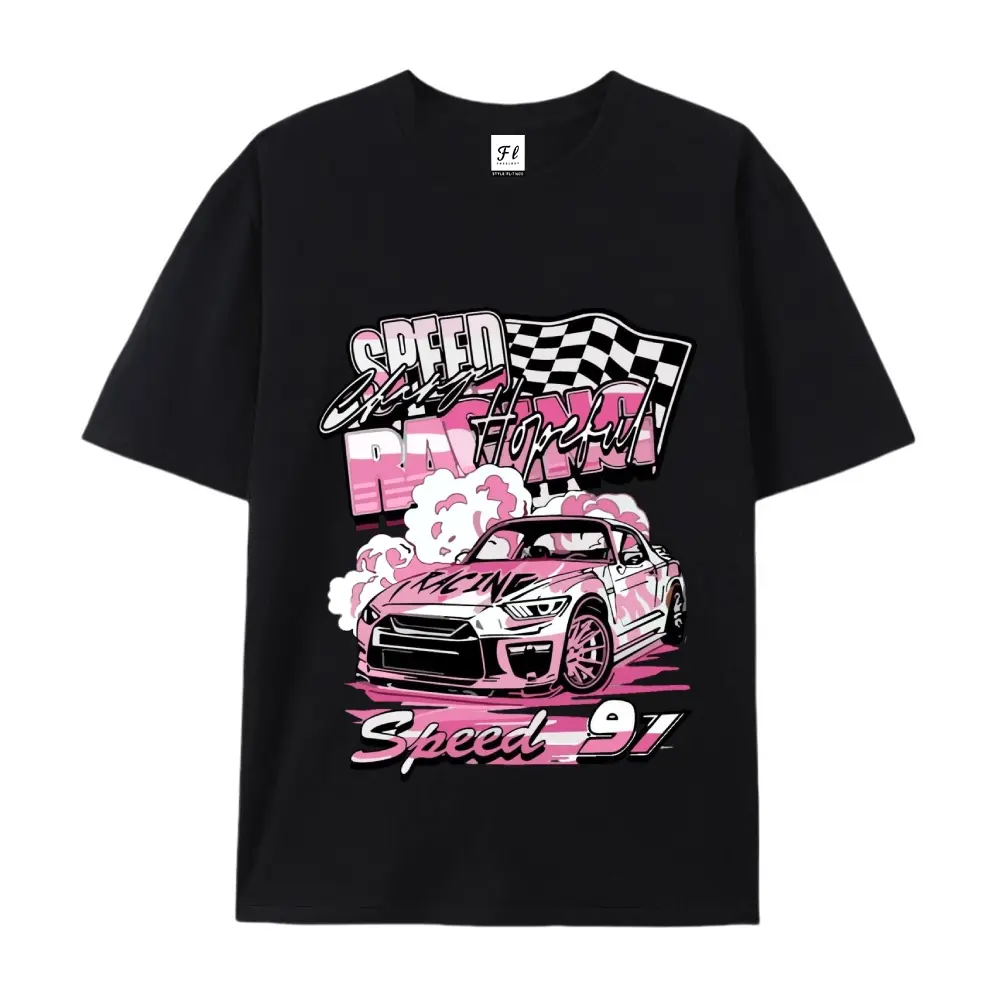 This soft cotton t-shirt features a vibrant pink racing car graphic with "Speed Racing" text, checkered flag, and smoke details, a trendy streetwear design perfect for car enthusiasts.